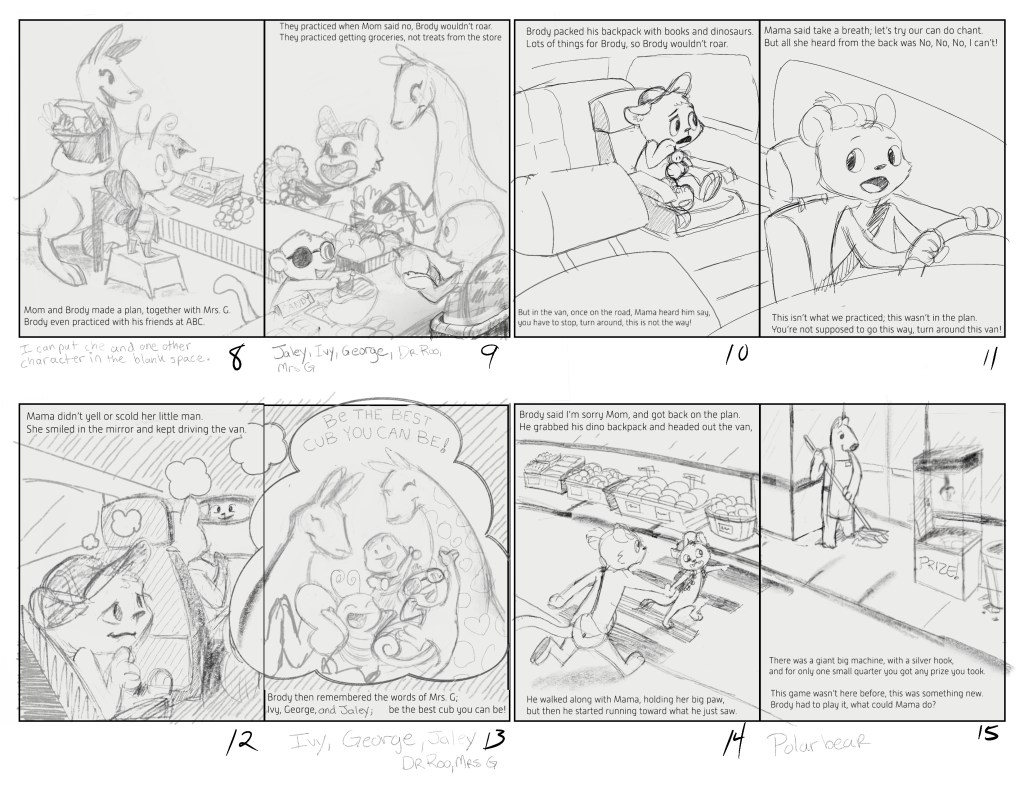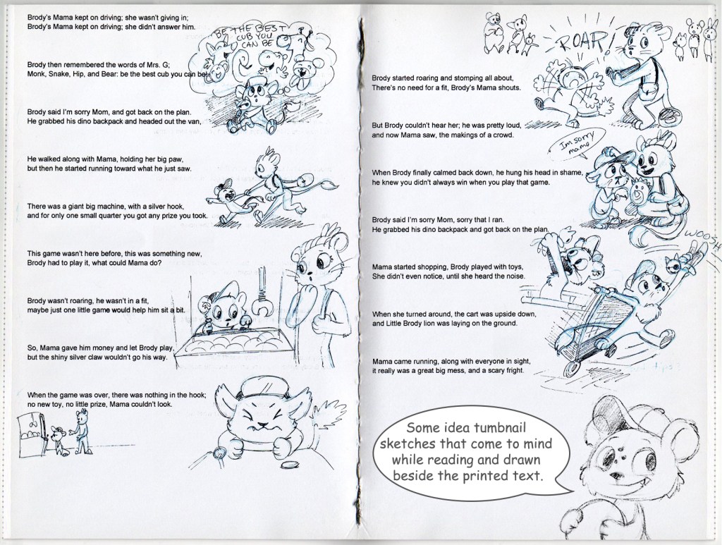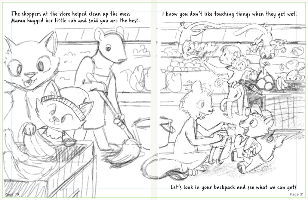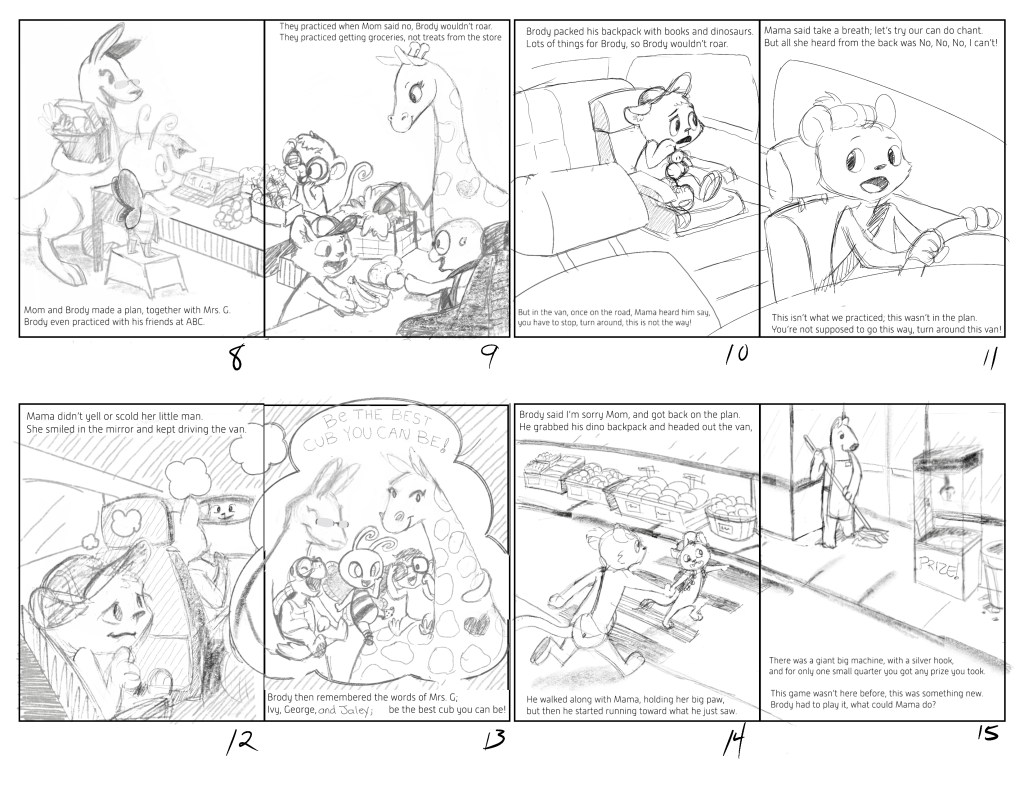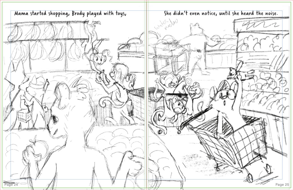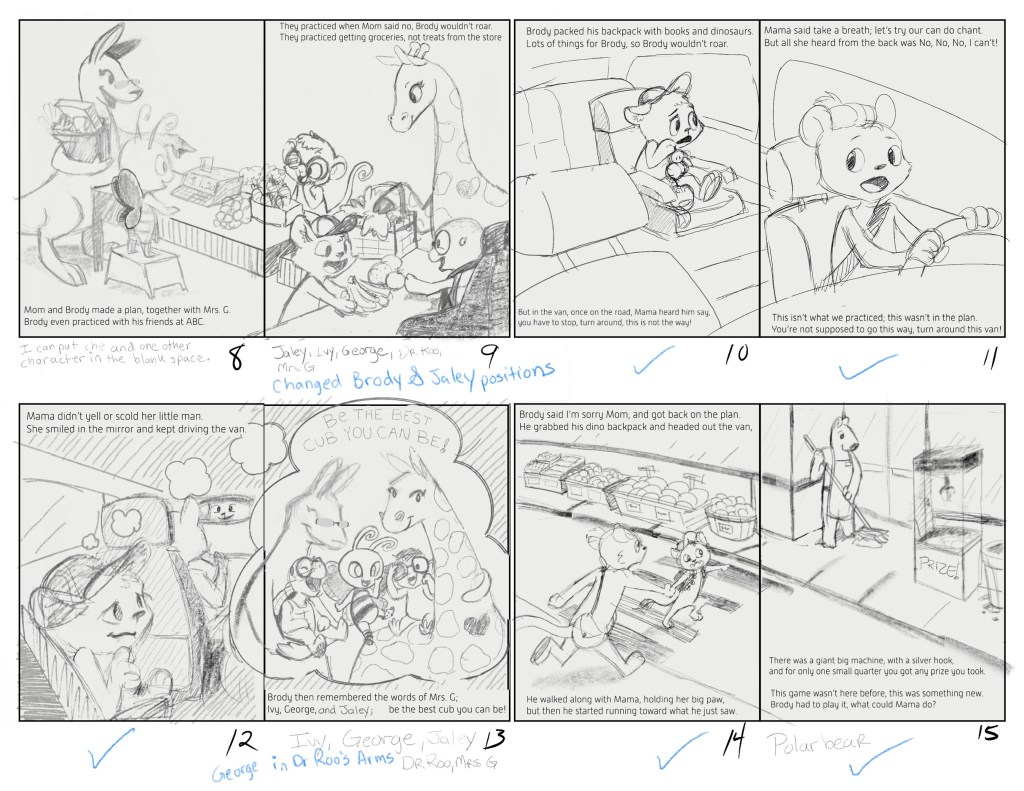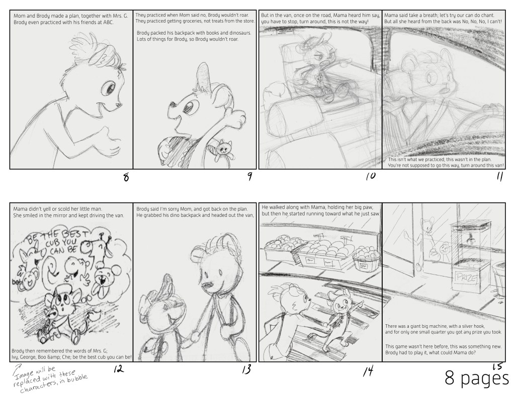 Final story thumbnail sketches sized to book dimensions, 8.5″ x 11″. The lines in the middle represent the gutter.