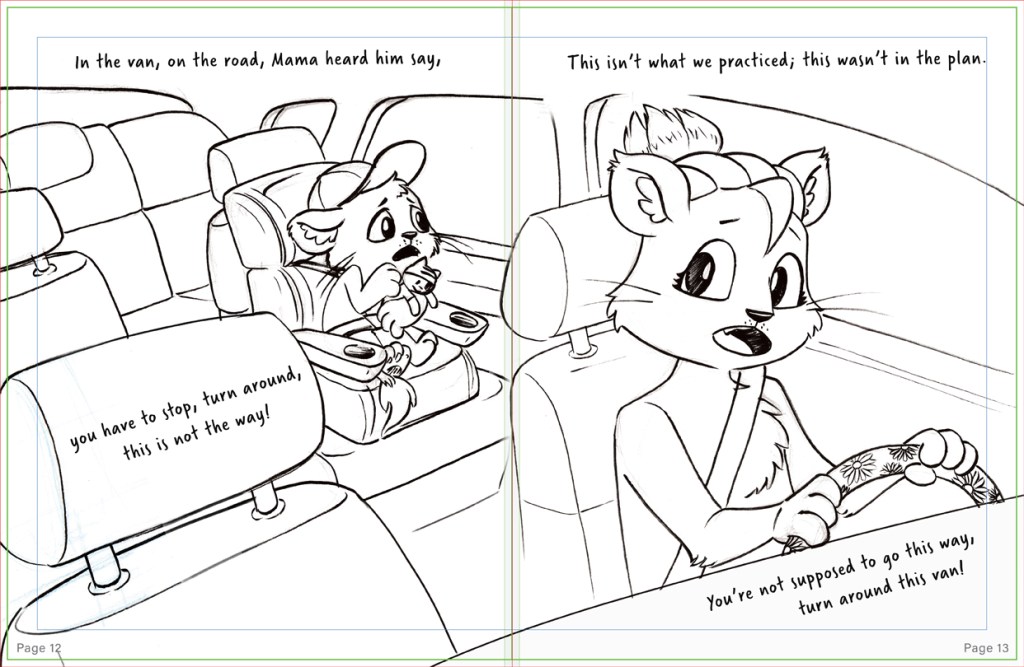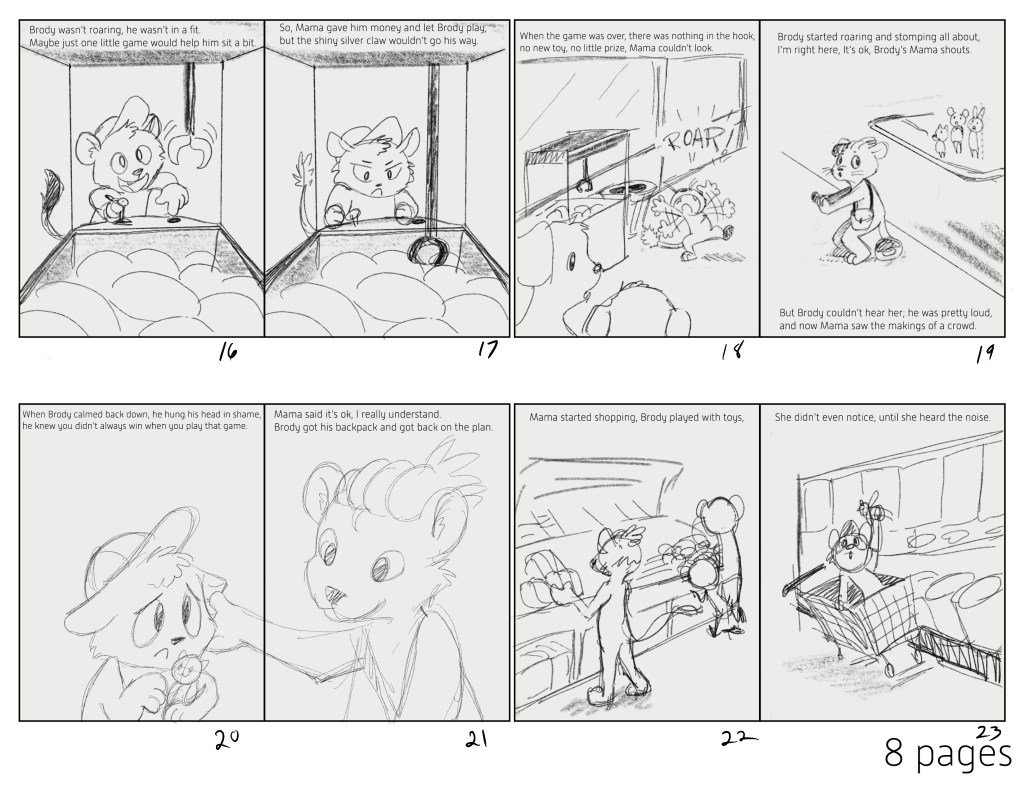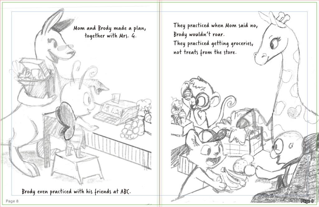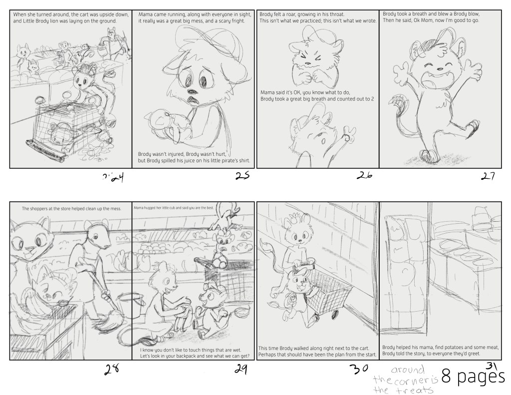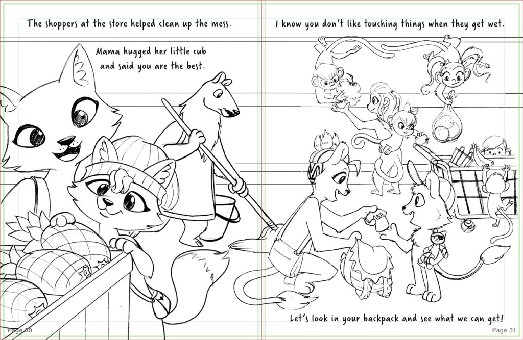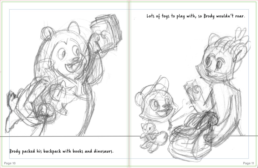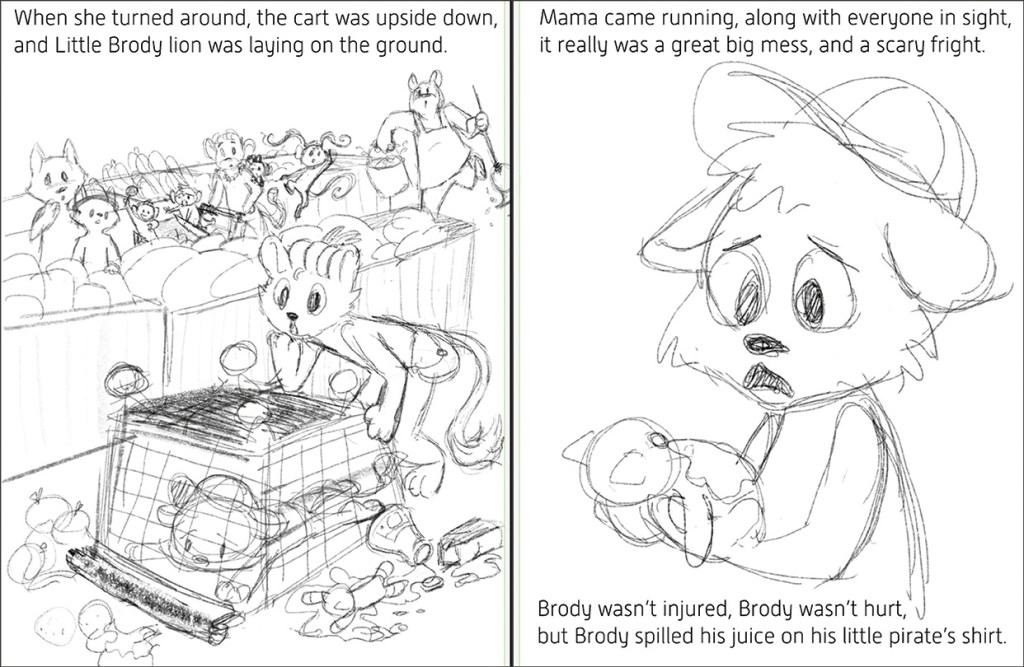 Final story thumbnail sketches sized to book dimensions, 8.5″ x 11″. The lines in the middle represent the gutter.