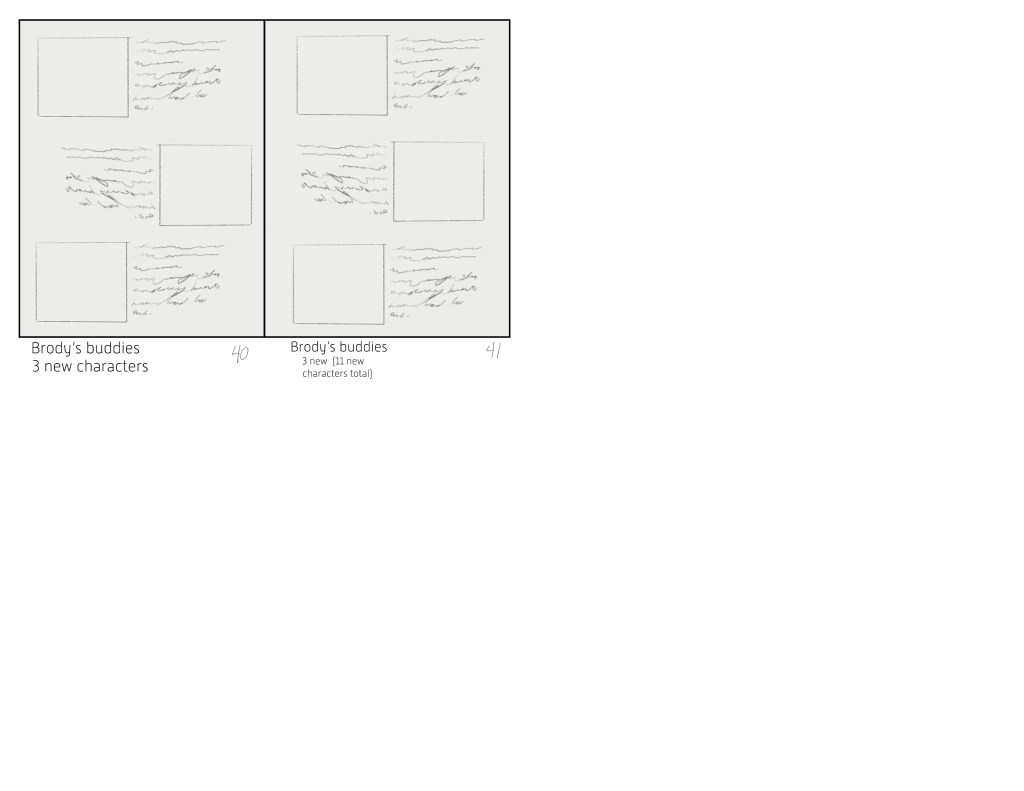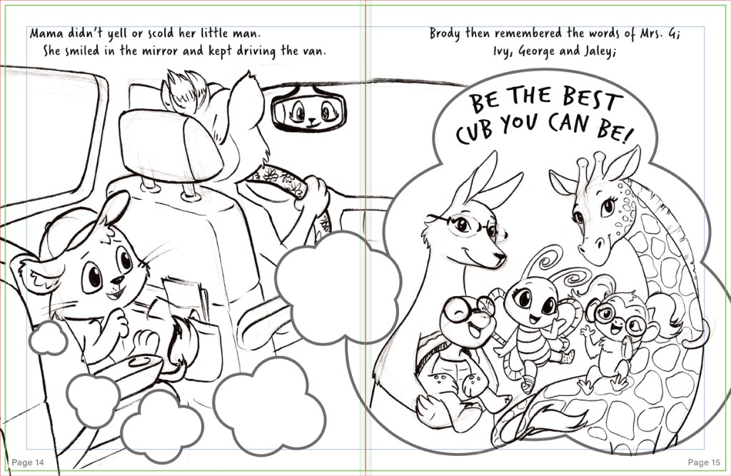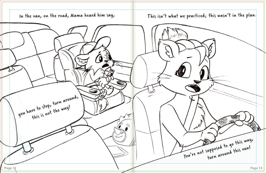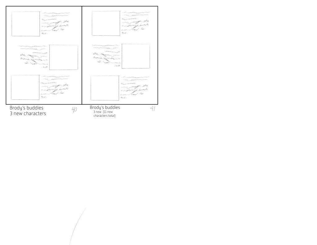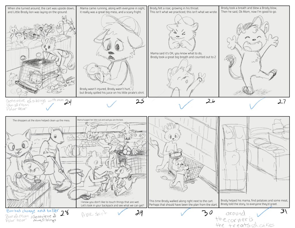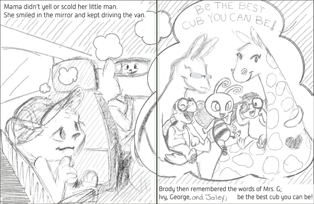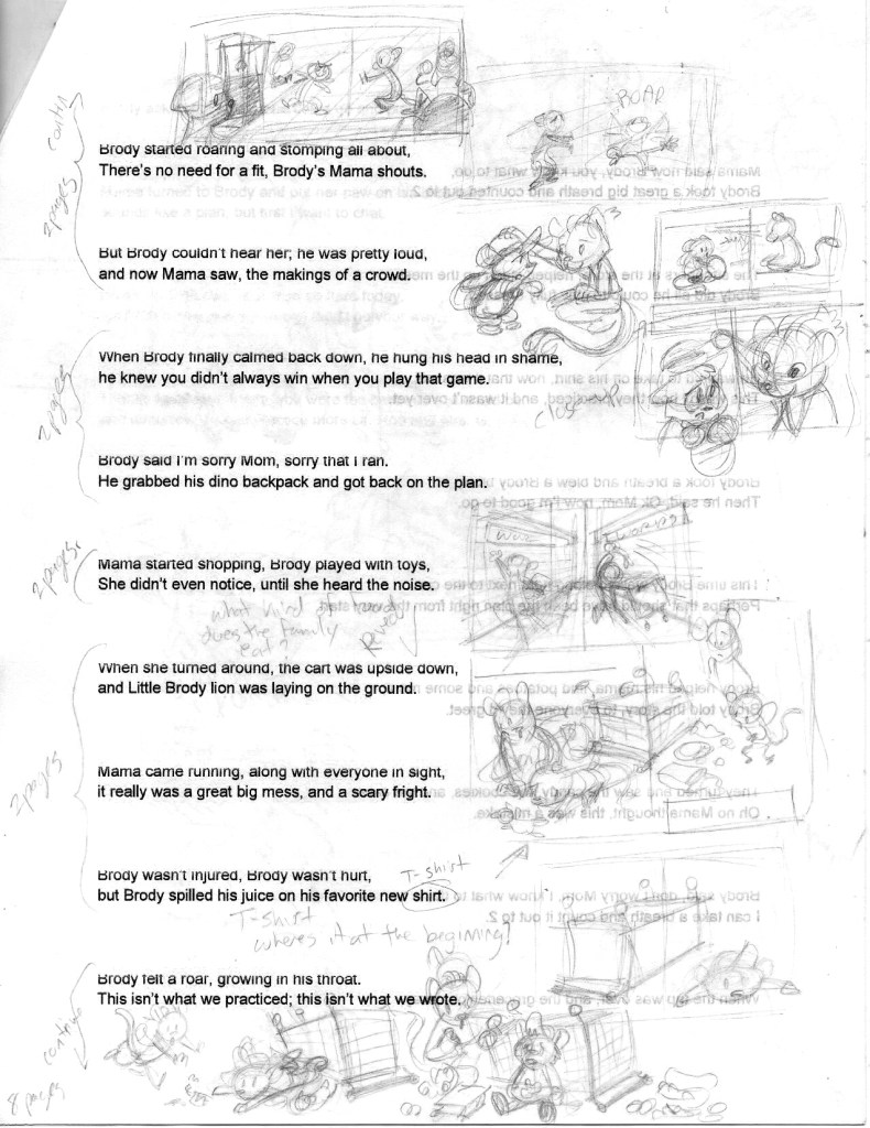 Final story thumbnail sketches sized to book dimensions, 8.5″ x 11″. The lines in the middle represent the gutter.