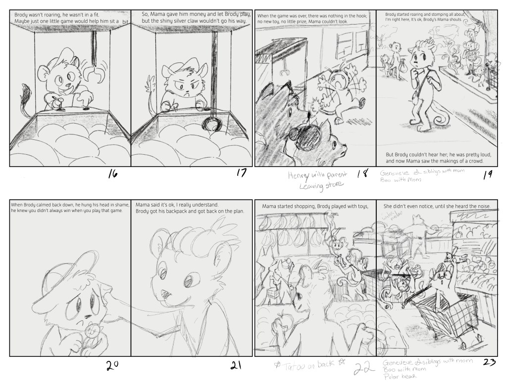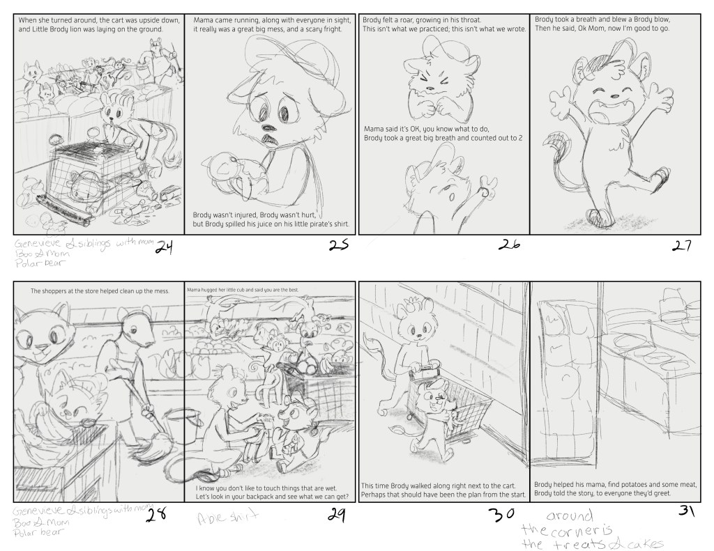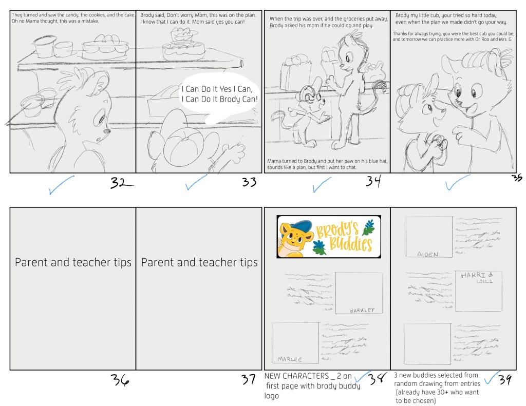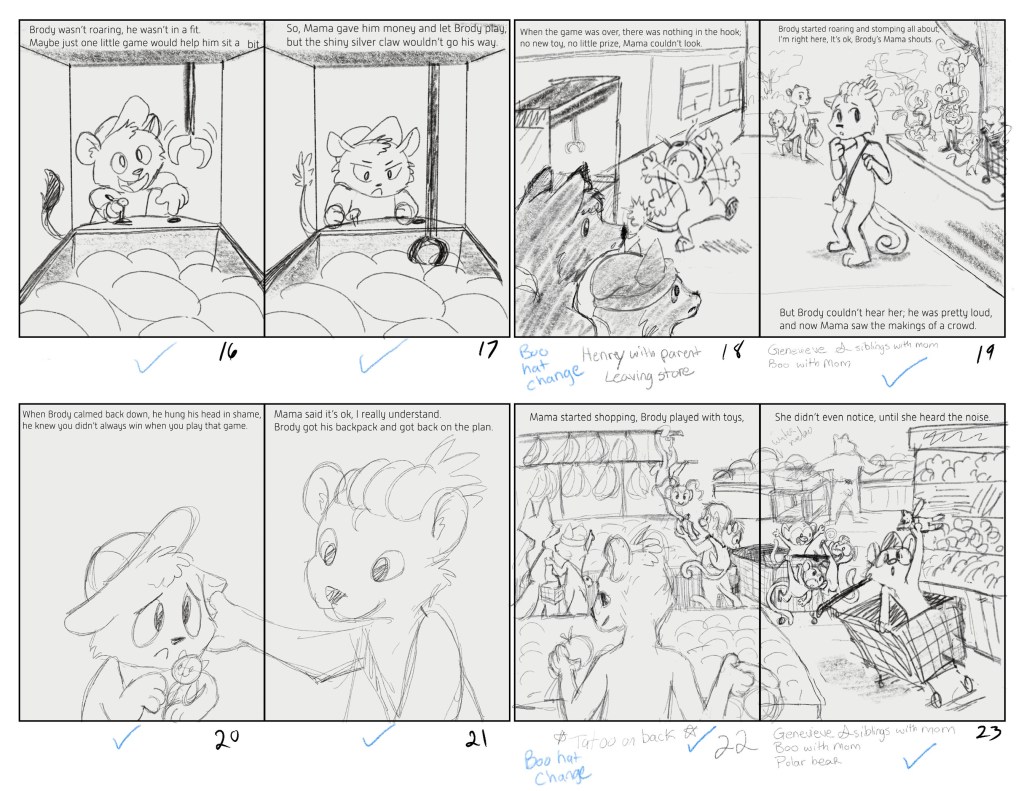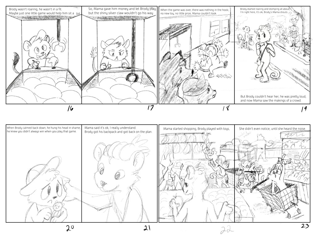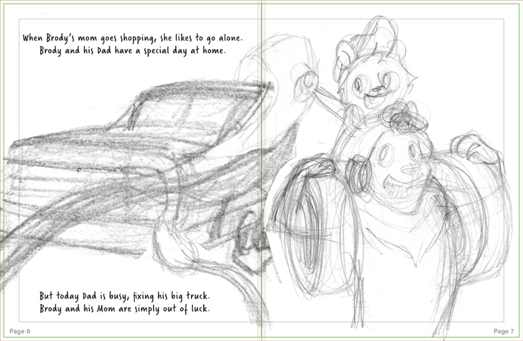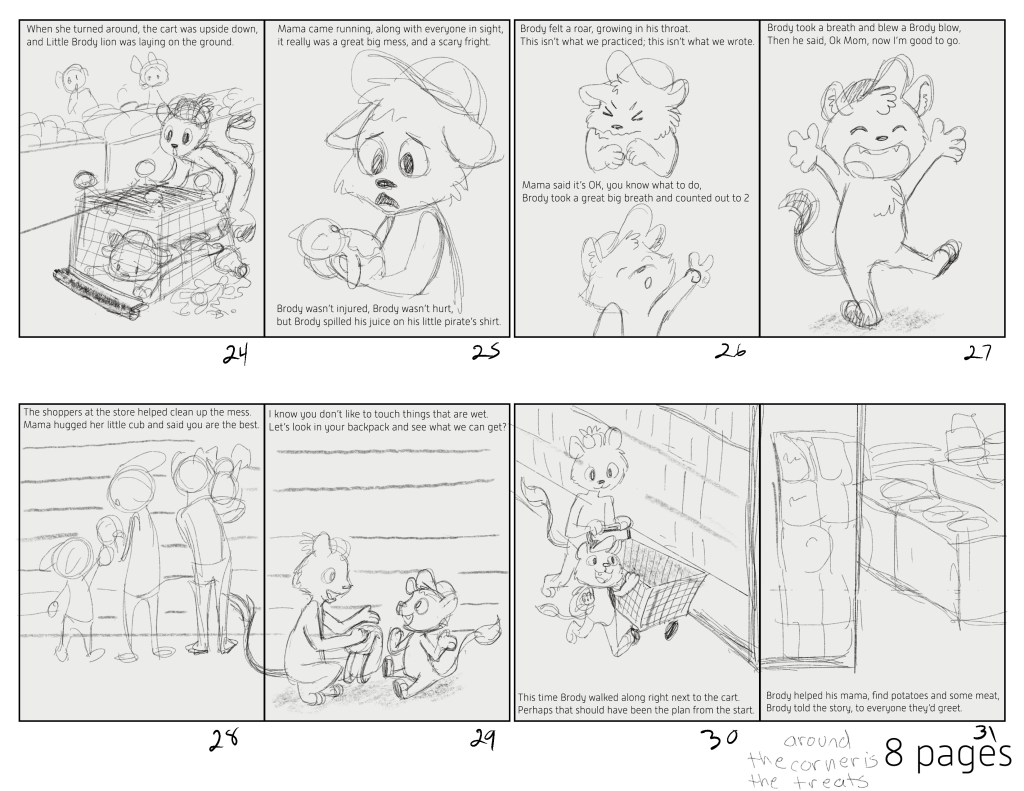 Final story thumbnail sketches sized to book dimensions, 8.5″ x 11″. The lines in the middle represent the gutter.