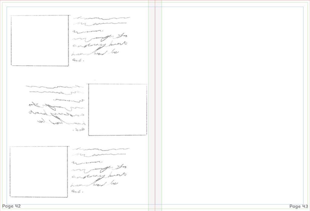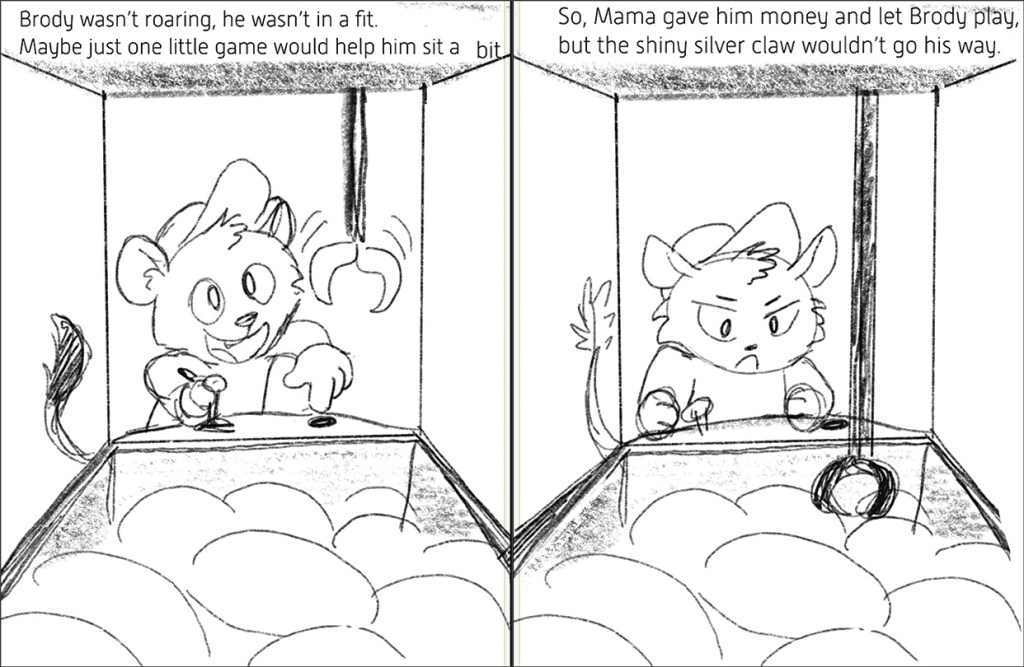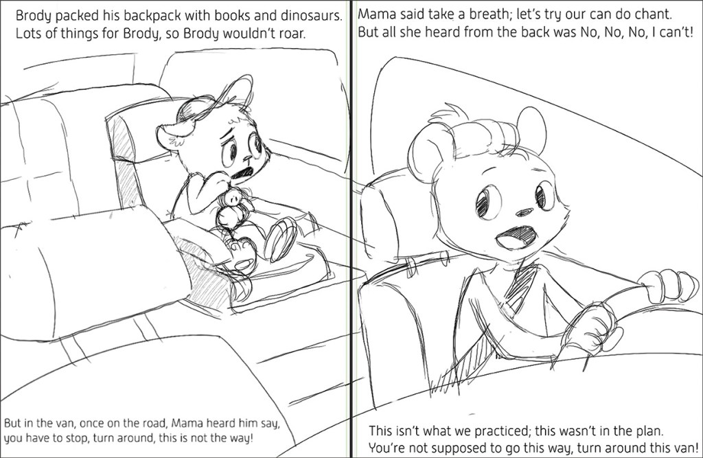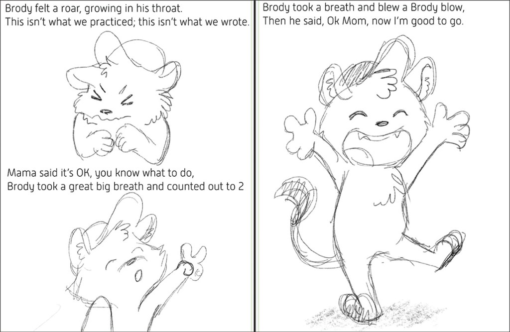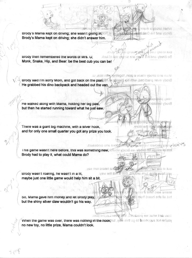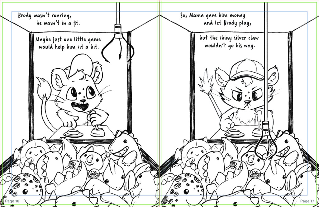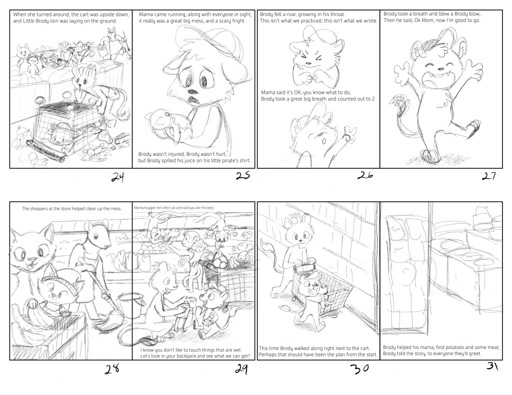 Final story thumbnail sketches sized to book dimensions, 8.5″ x 11″. The lines in the middle represent the gutter.