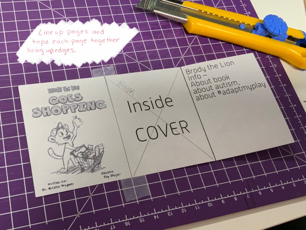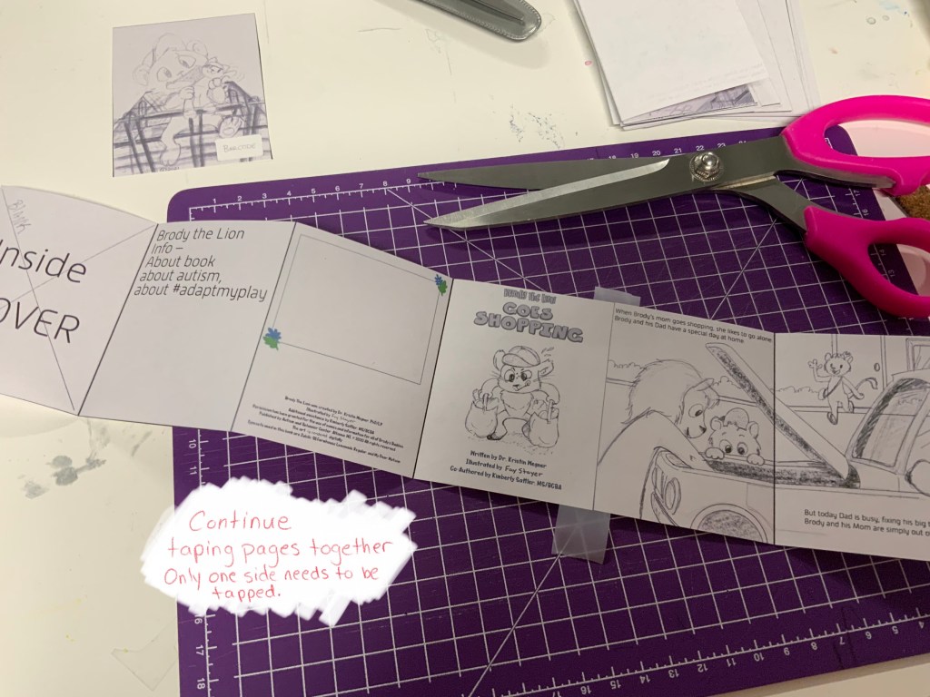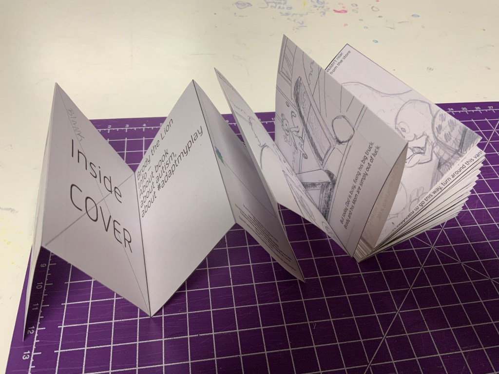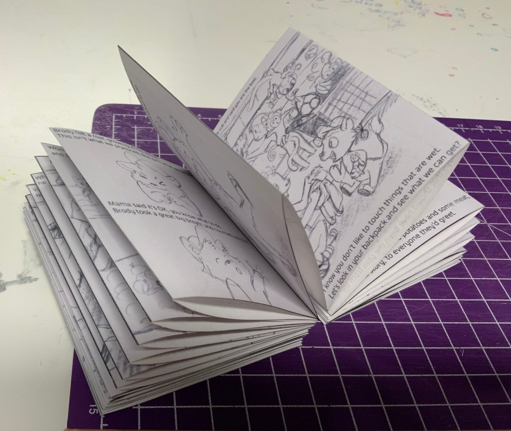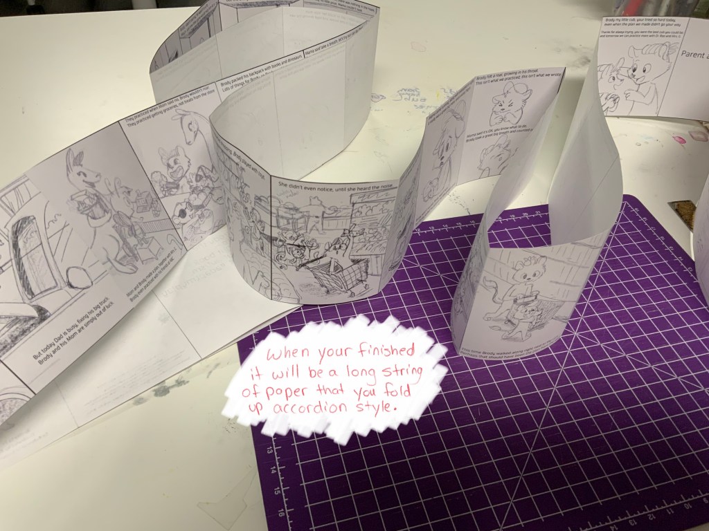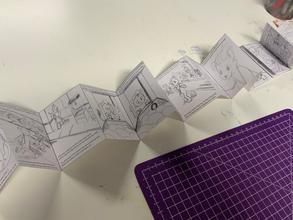 Thumbnail booklet accordion method: Print and cut pages into two story pages. Only cut the front and back page apart and the rest of the pages are folded in half. To help crease edges use a small ruler or bone tool. Tape each page together edge to edge then trim off excess tape and continue with remaining pages. Once done you will have a continuous string of pages that will fold up into the booklet. Put the booklet under a few heavy books to help flatten it down.