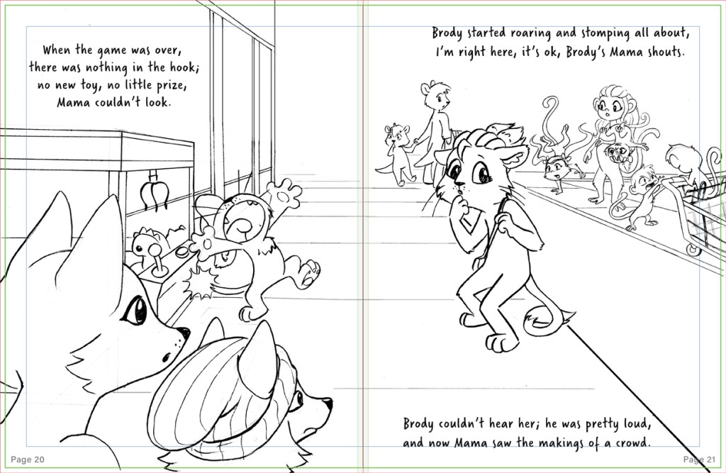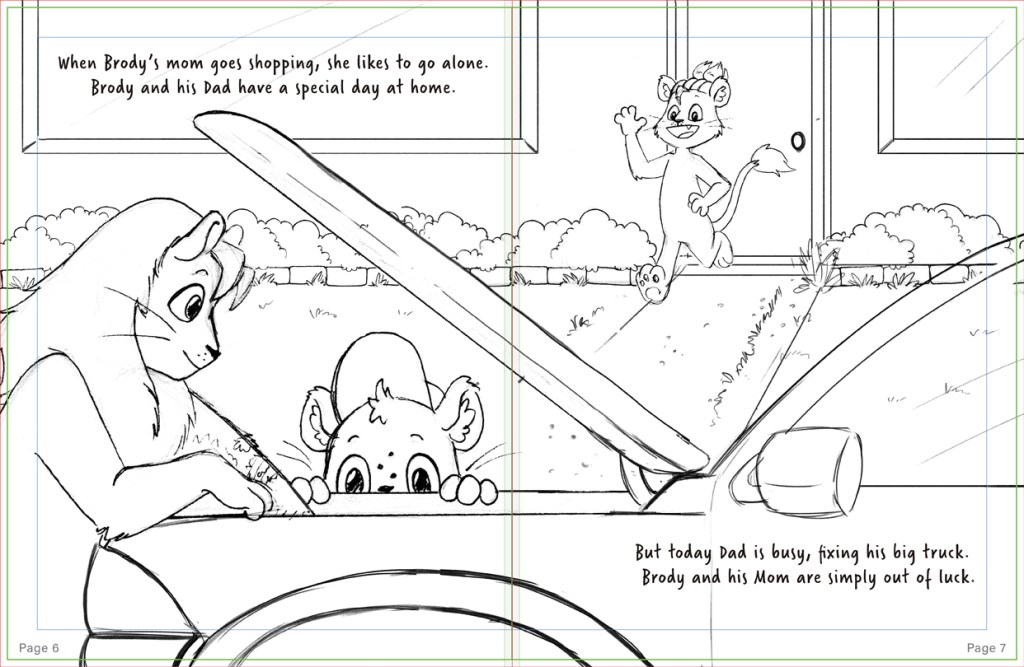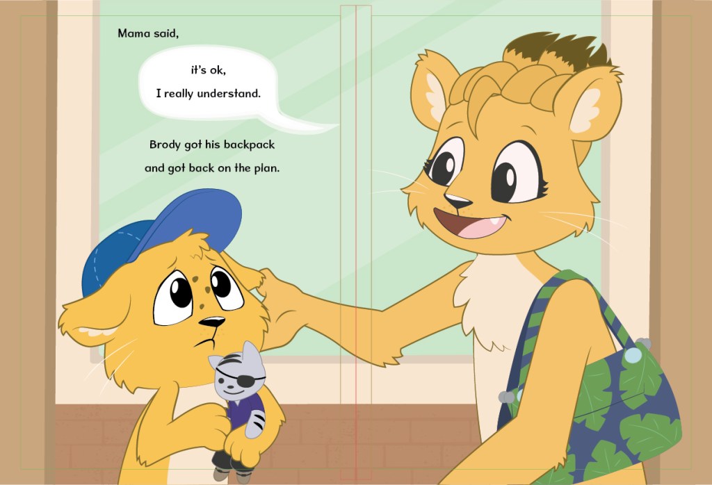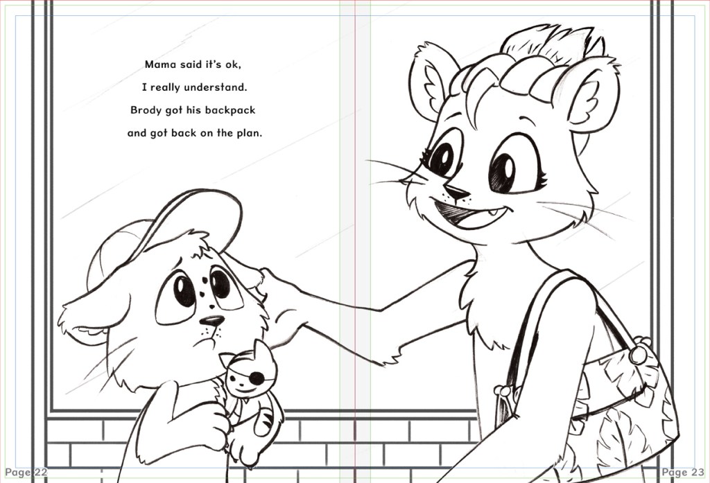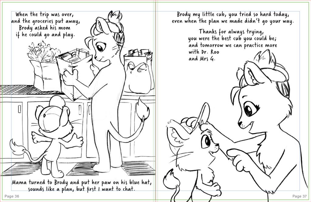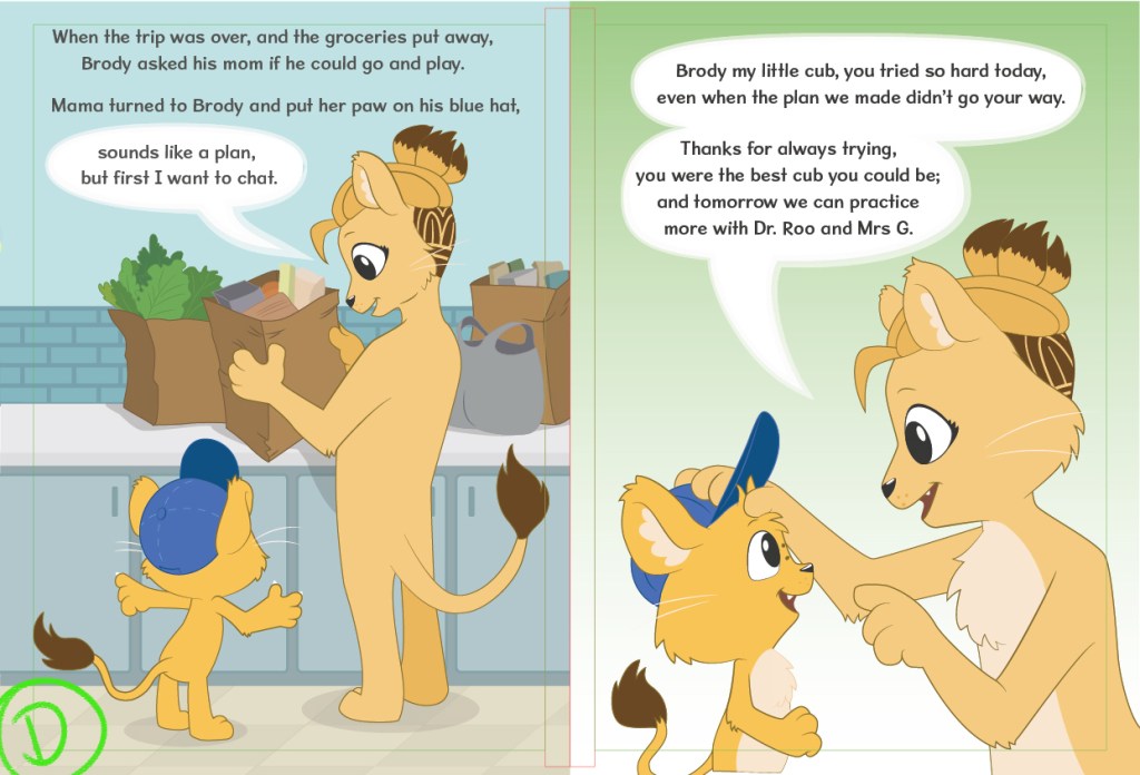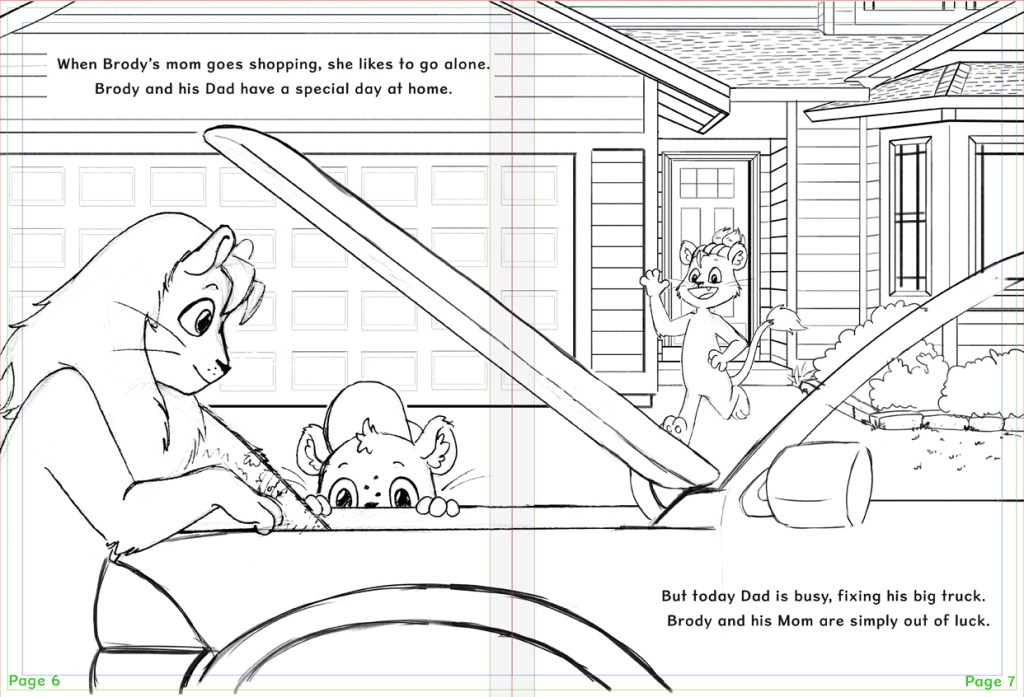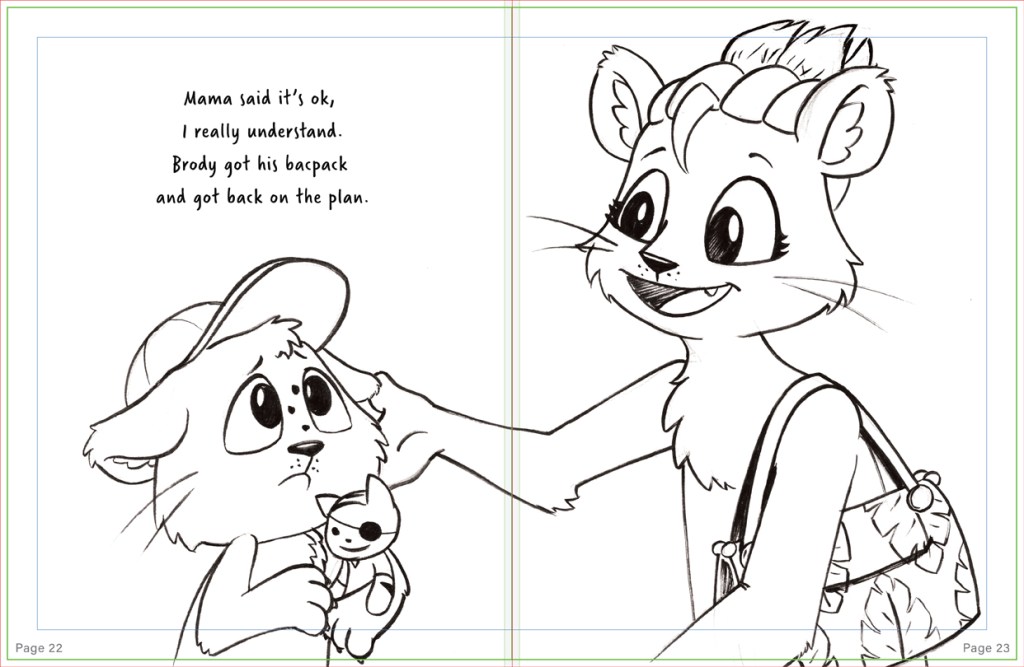 Changes to the cover and inside title page. I’ve created Pages 10, 11, 12, 13 and I’ve changed Brody’s mum’s hair color a bit to vary from her fur color. Pages 12 and 13 I’ve uploaded two of them with different text layout.
