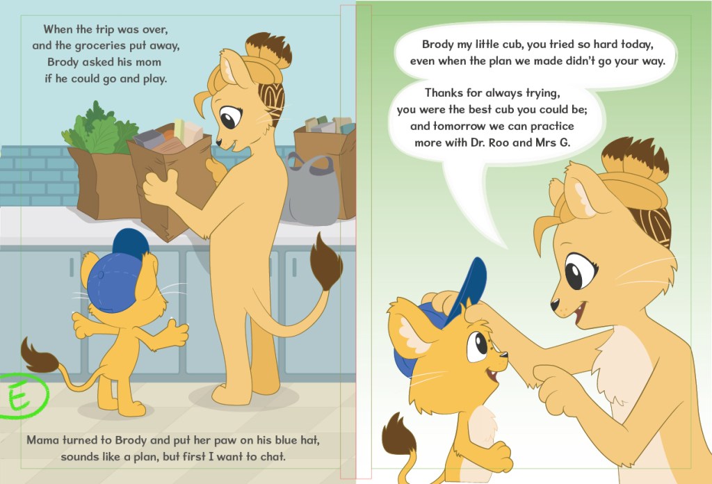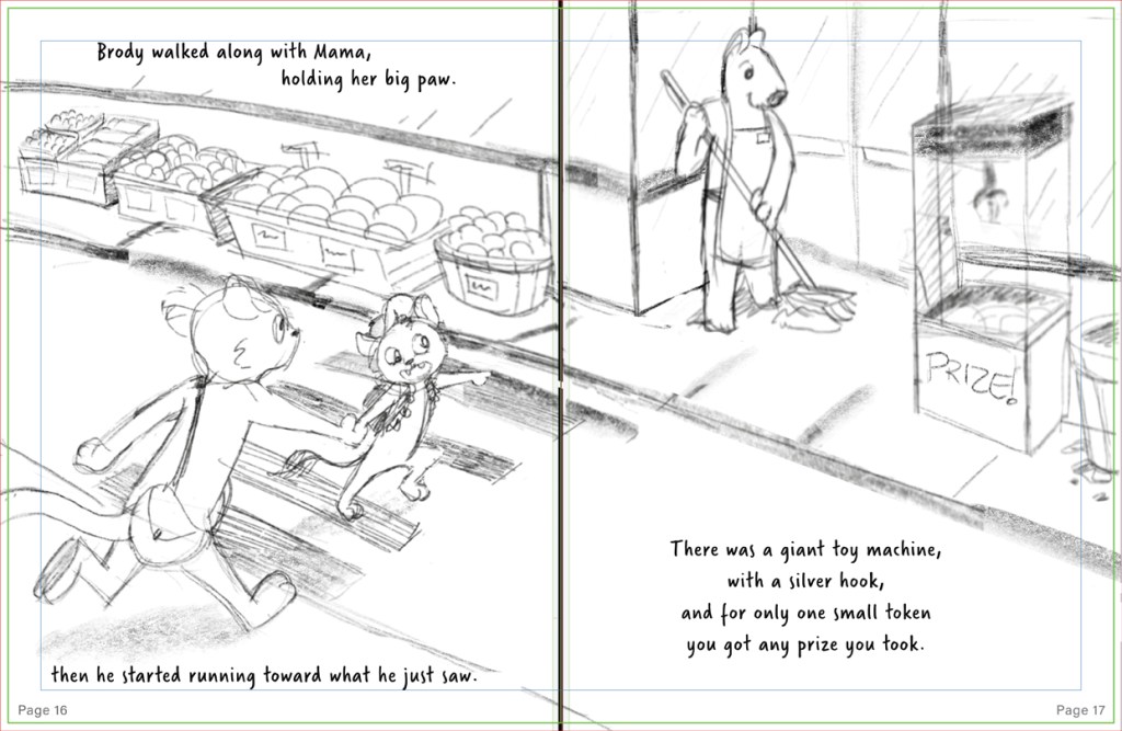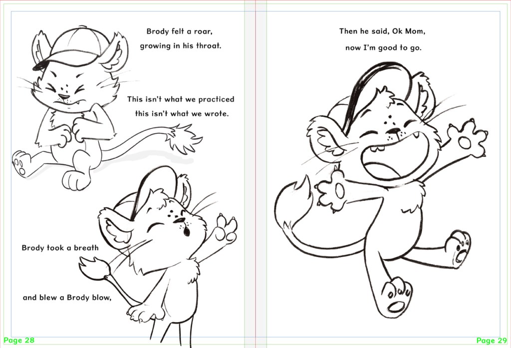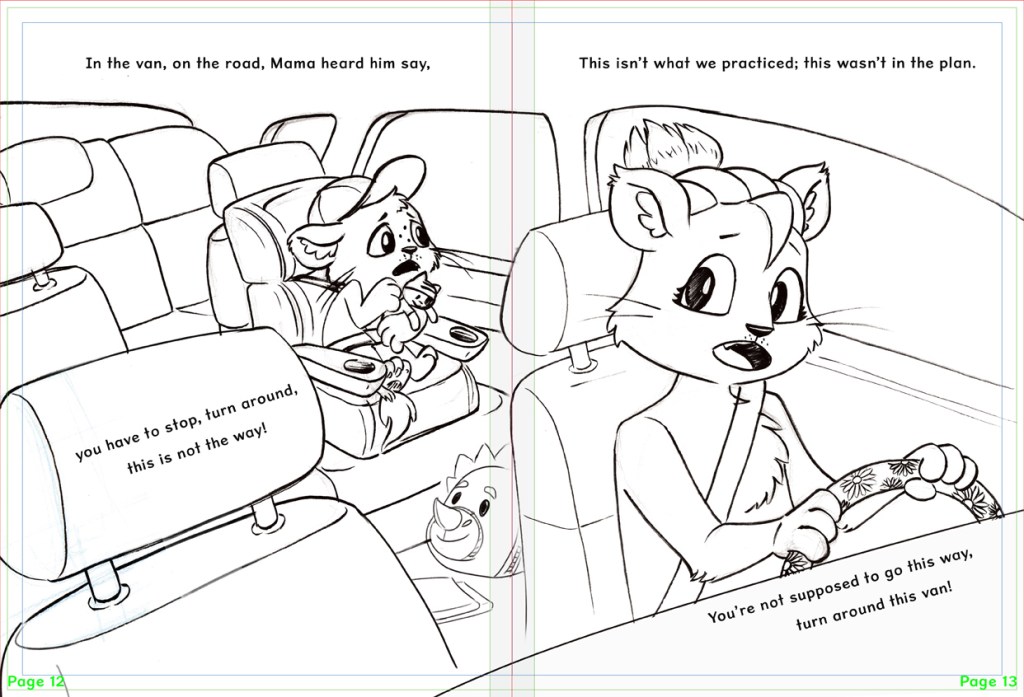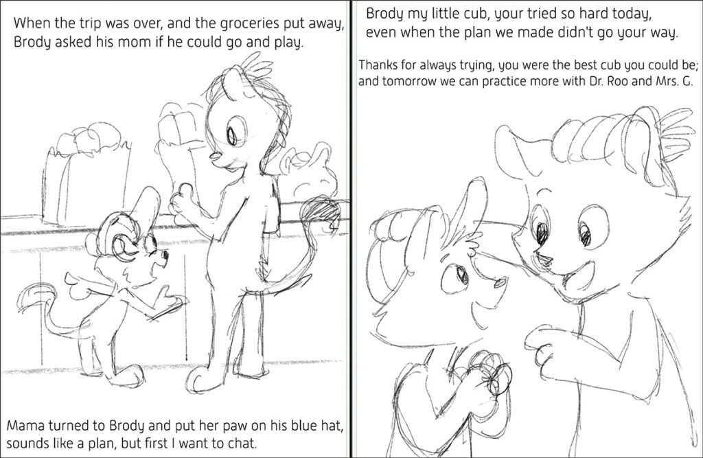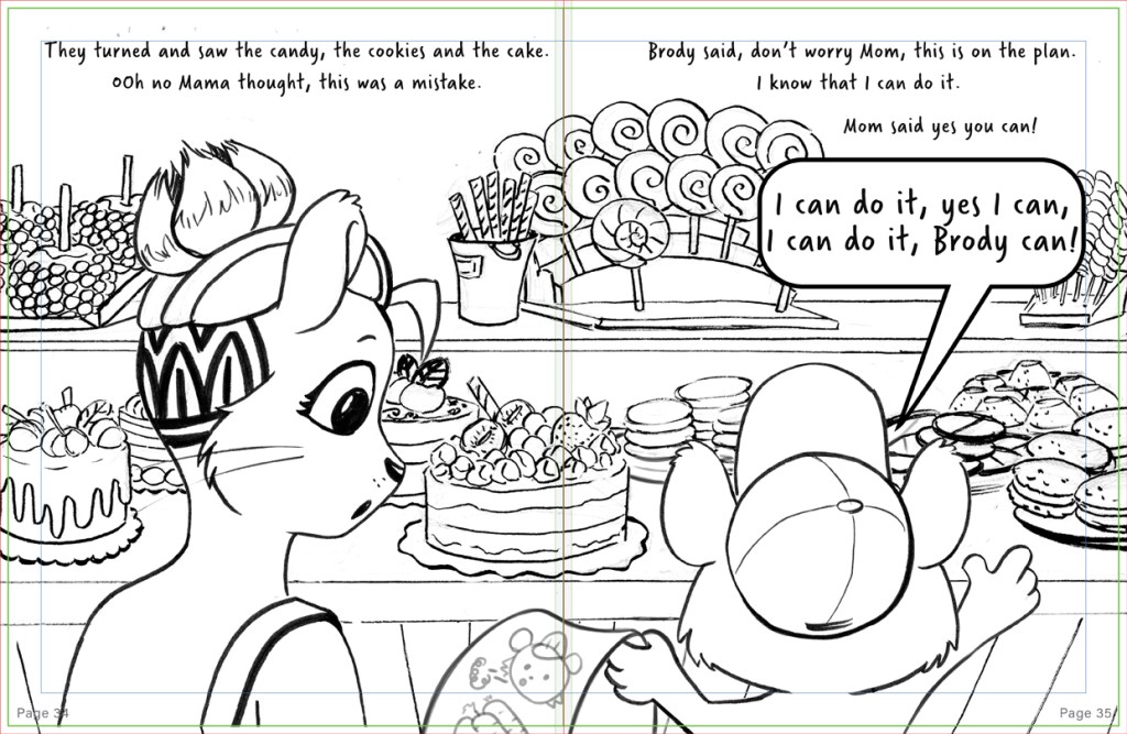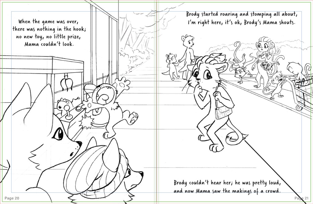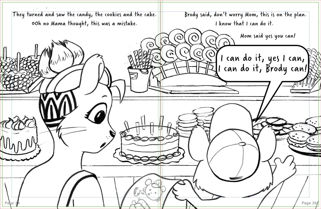 Changes to the cover and inside title page. I’ve created Pages 10, 11, 12, 13 and I’ve changed Brody’s mum’s hair color a bit to vary from her fur color. Pages 12 and 13 I’ve uploaded two of them with different text layout.