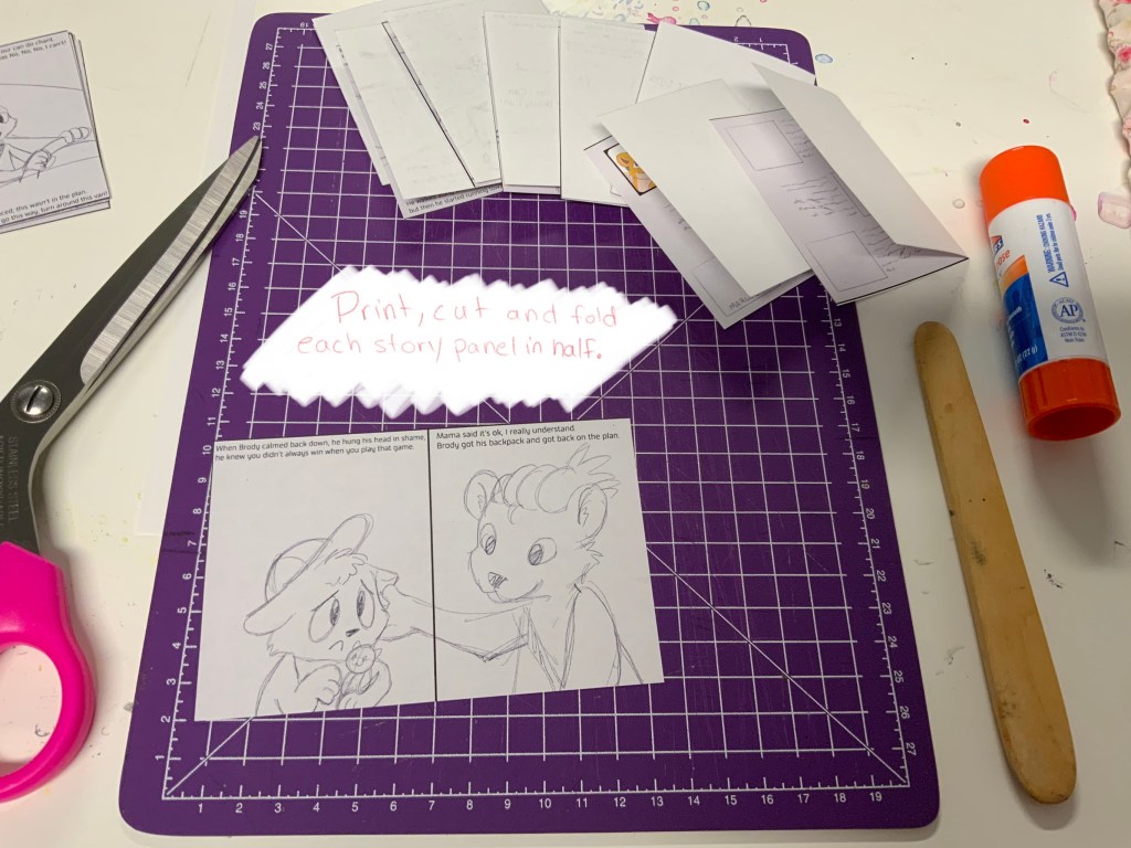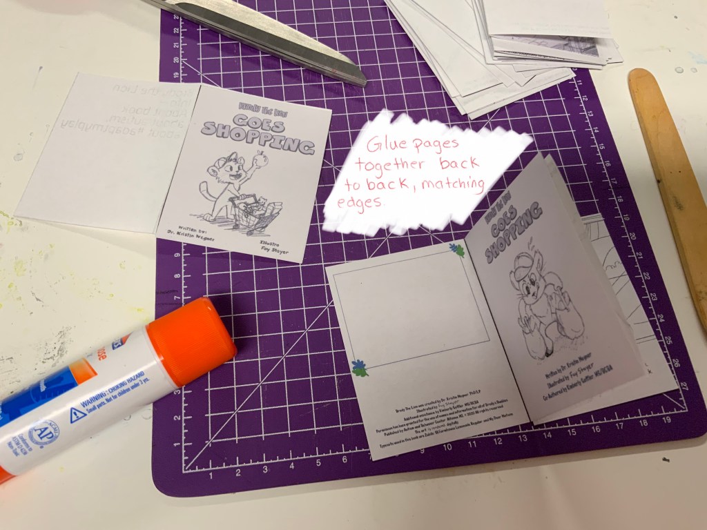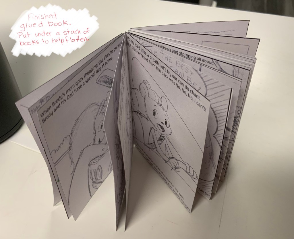 Thumbnail booklet, glue method: Print and cut pages into two story pages. Only cut the front and back page apart and the rest of the pages are folded in half. To help crease edges use a small ruler or bone tool. Glue pages in order back to back and smooth each page down with a ruler or bone tool. Once all the pages are glued together put the mini booklet under heavy books to help flatten.