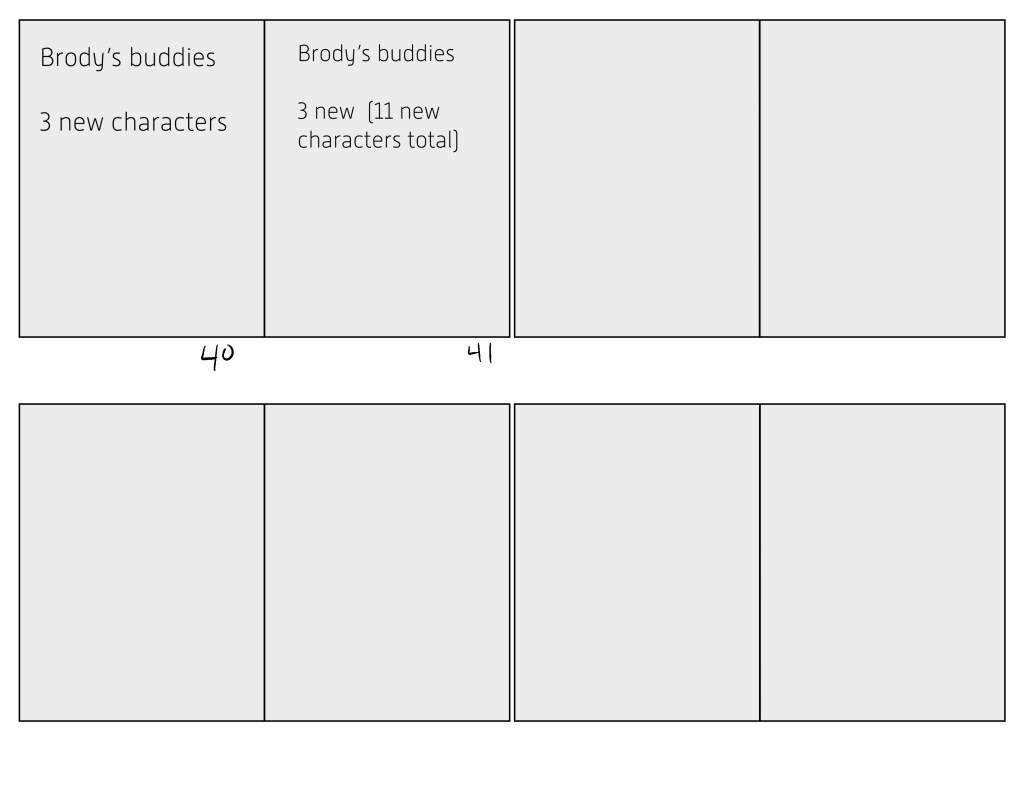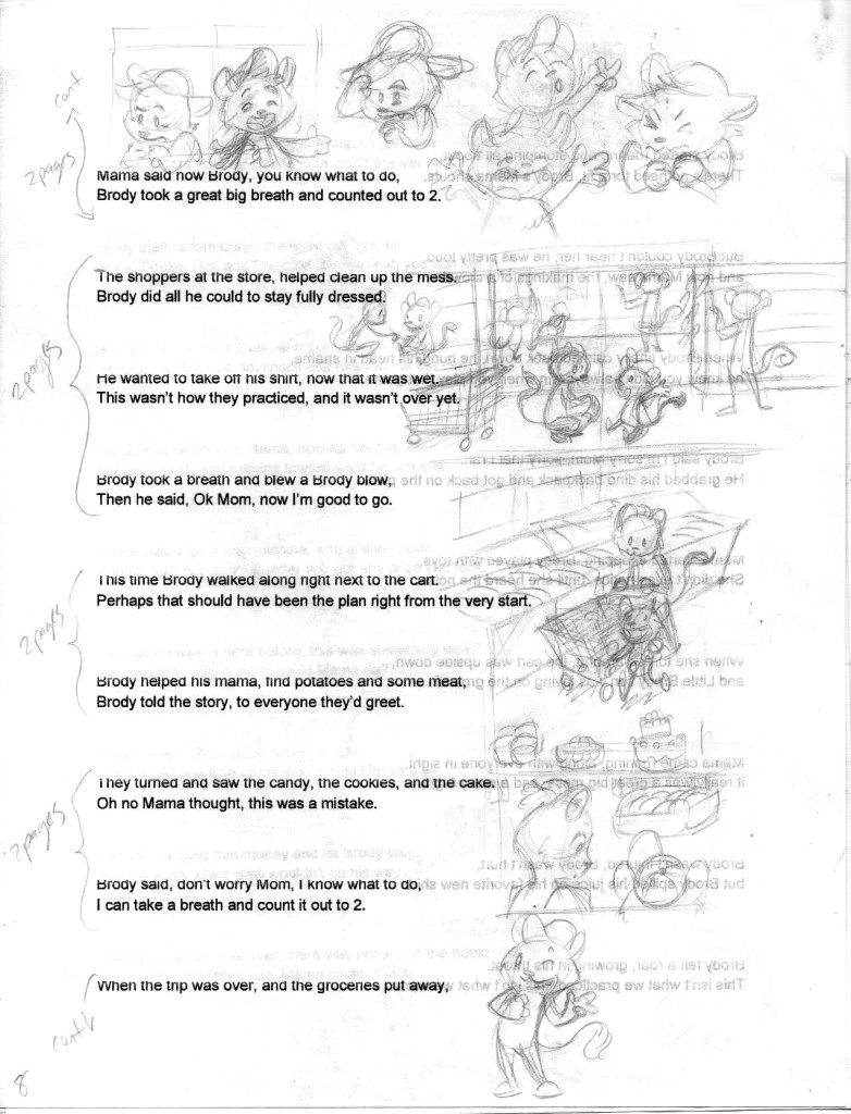 Thumbnail sketches laid out with story. The labels ‘Page 2, Page 8, Page 4’ are counting the number of illustrations.