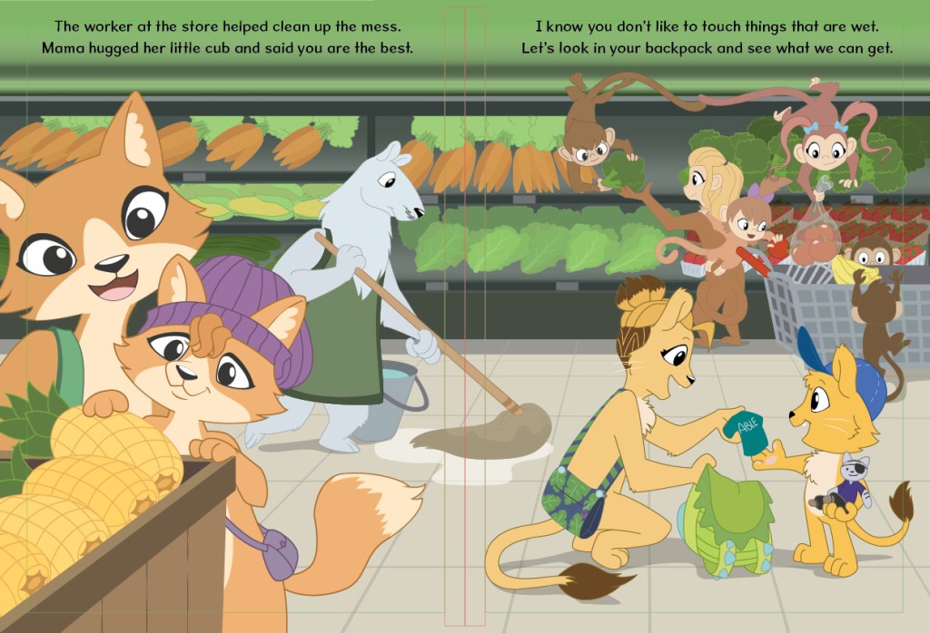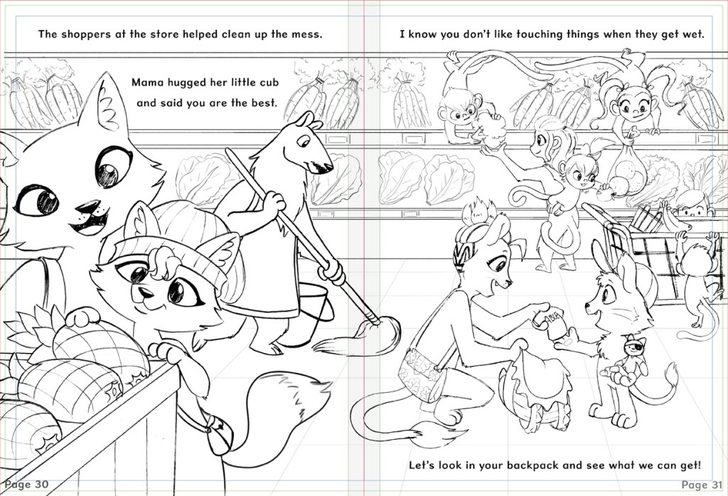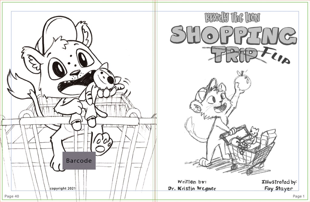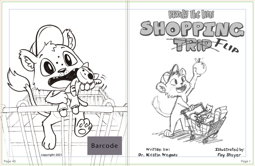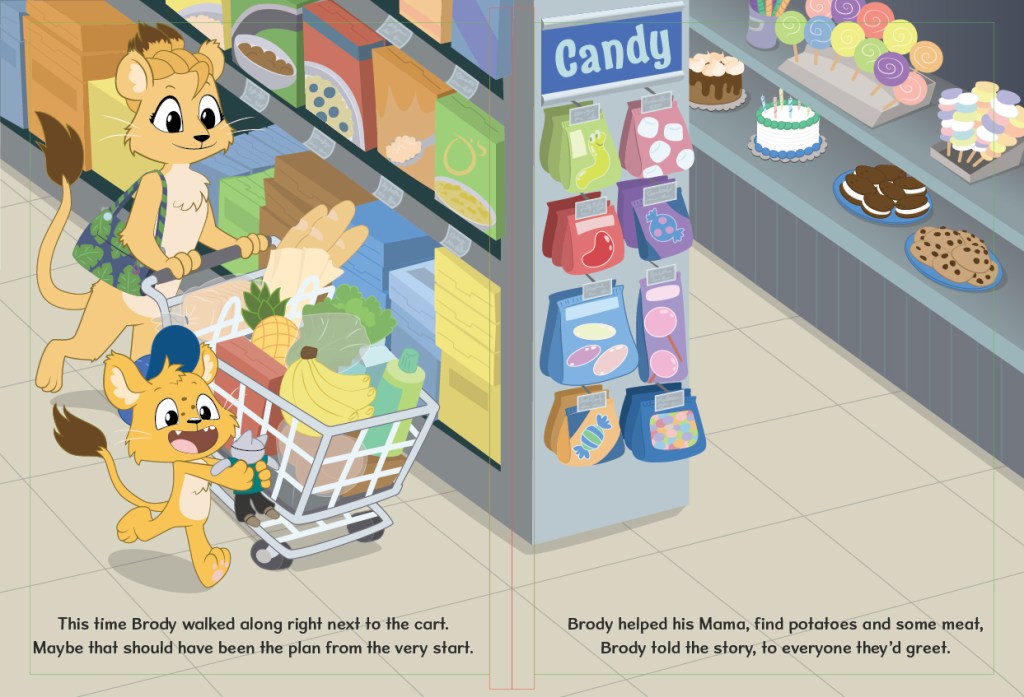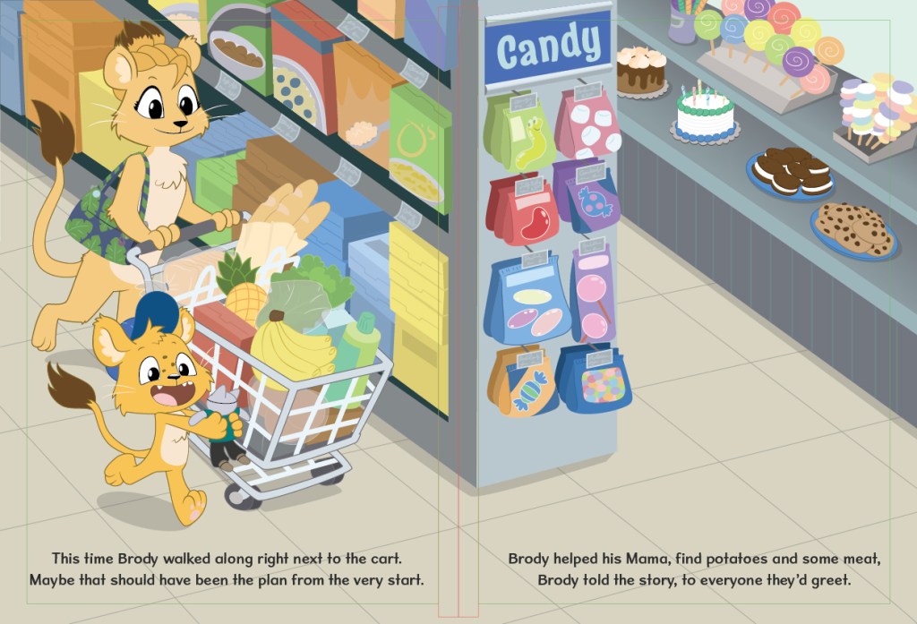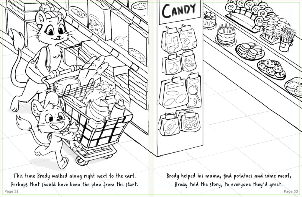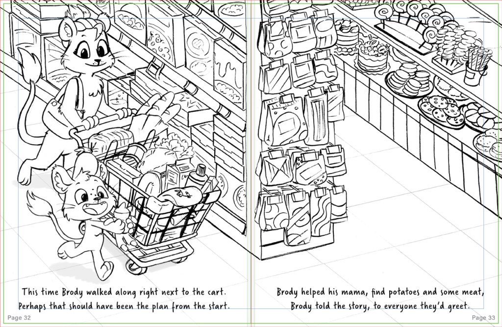 Updated pages based on notes from last meeting. The page numbers in green represent good/approved. I’ve made some minor position changes to text placement, changed to font ‘Sweater School’ and other fonts for the title. Worked out some of the backgrounds a bit further spacing them out as well as the grocery store pages.