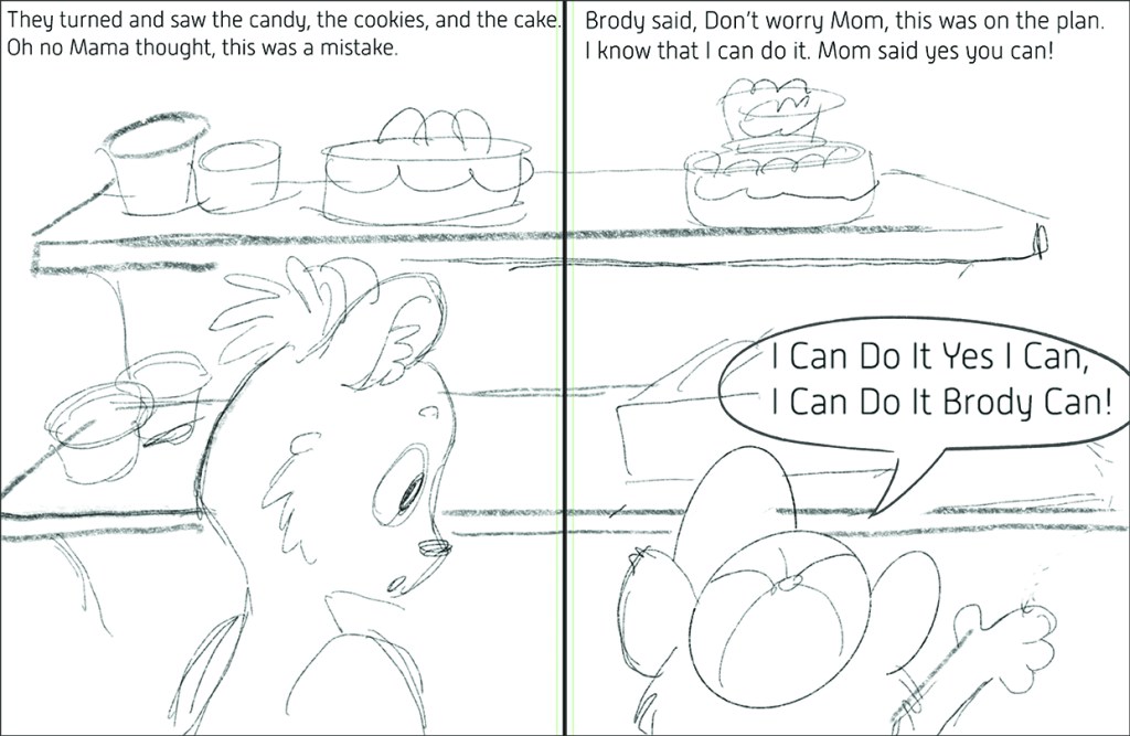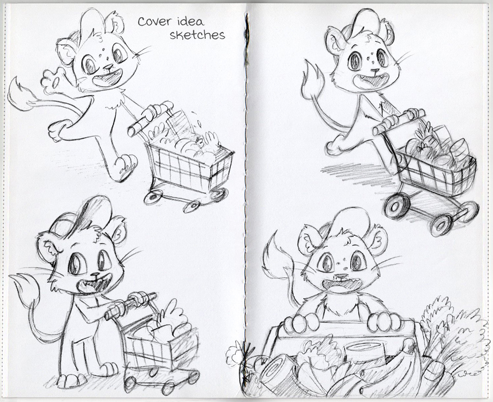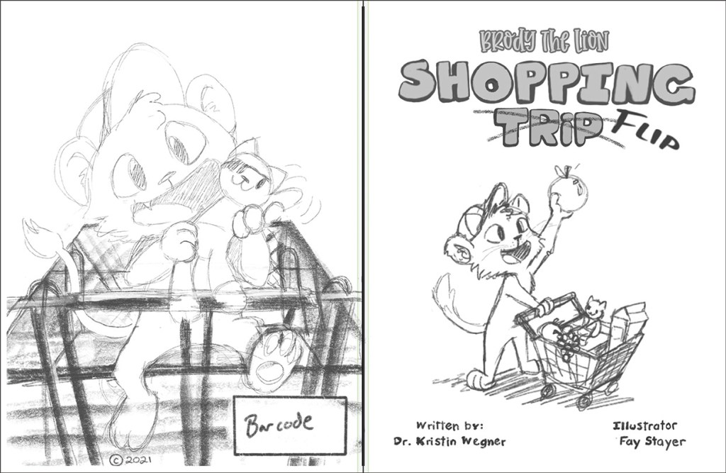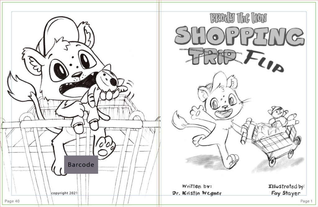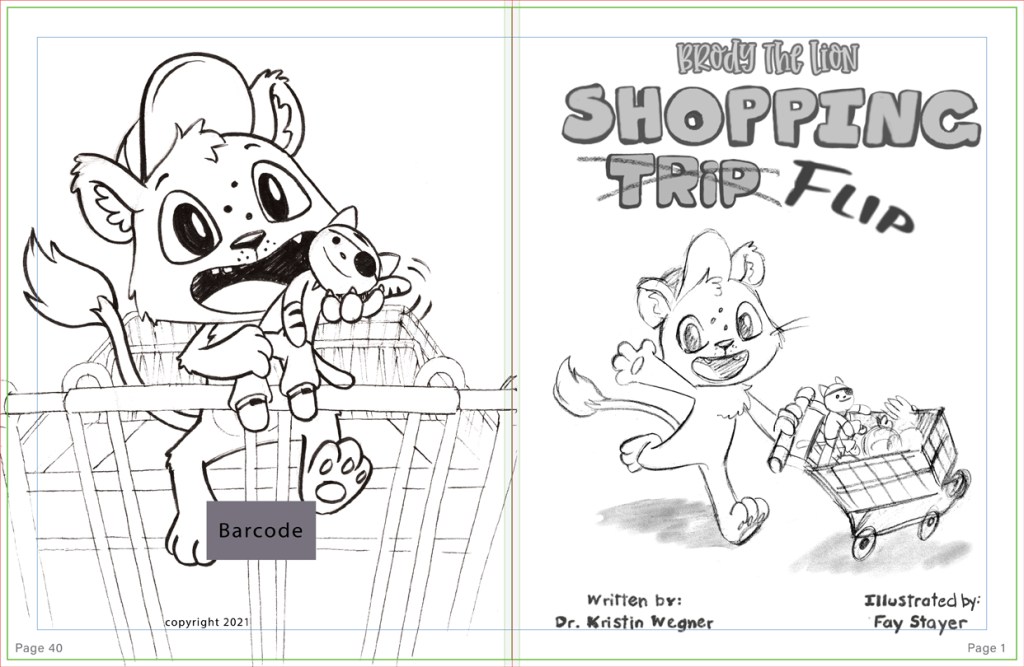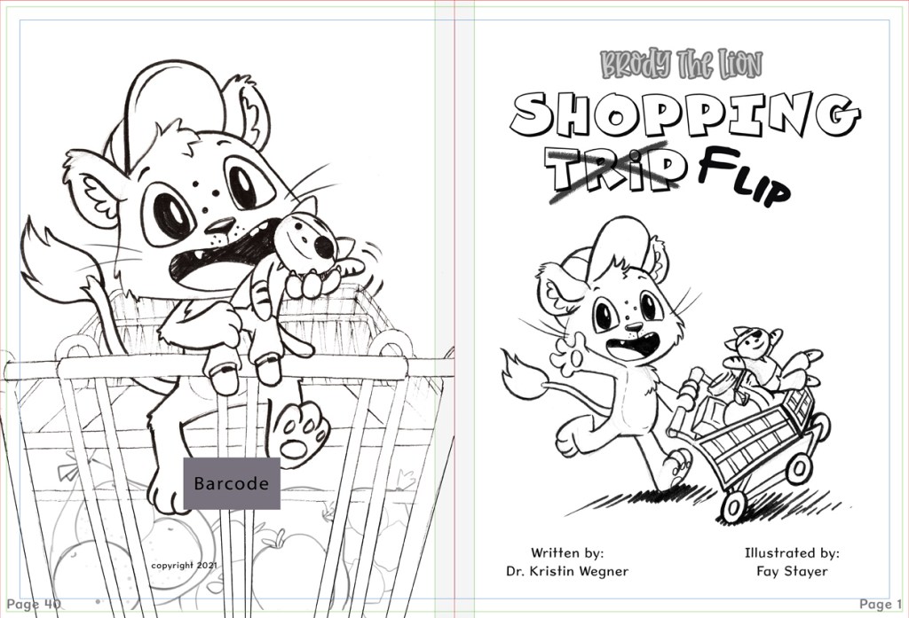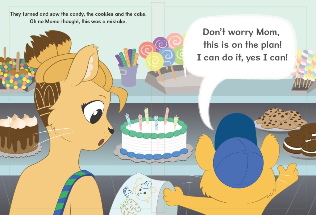 Updated pages based on notes from last meeting. The page numbers in green represent good/approved. I’ve made some minor position changes to text placement, changed to font ‘Sweater School’ and other fonts for the title. Worked out some of the backgrounds a bit further spacing them out as well as the grocery store pages.