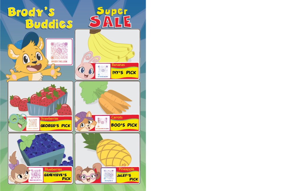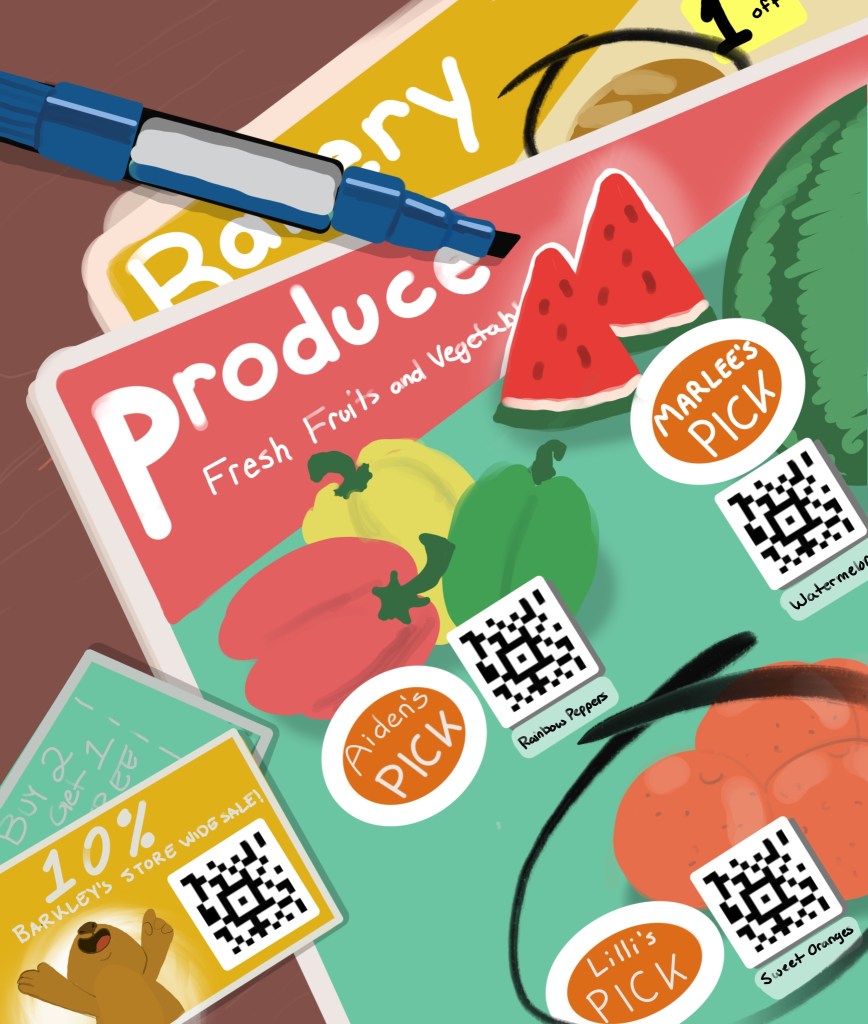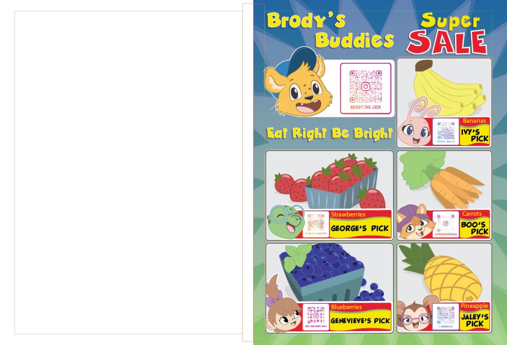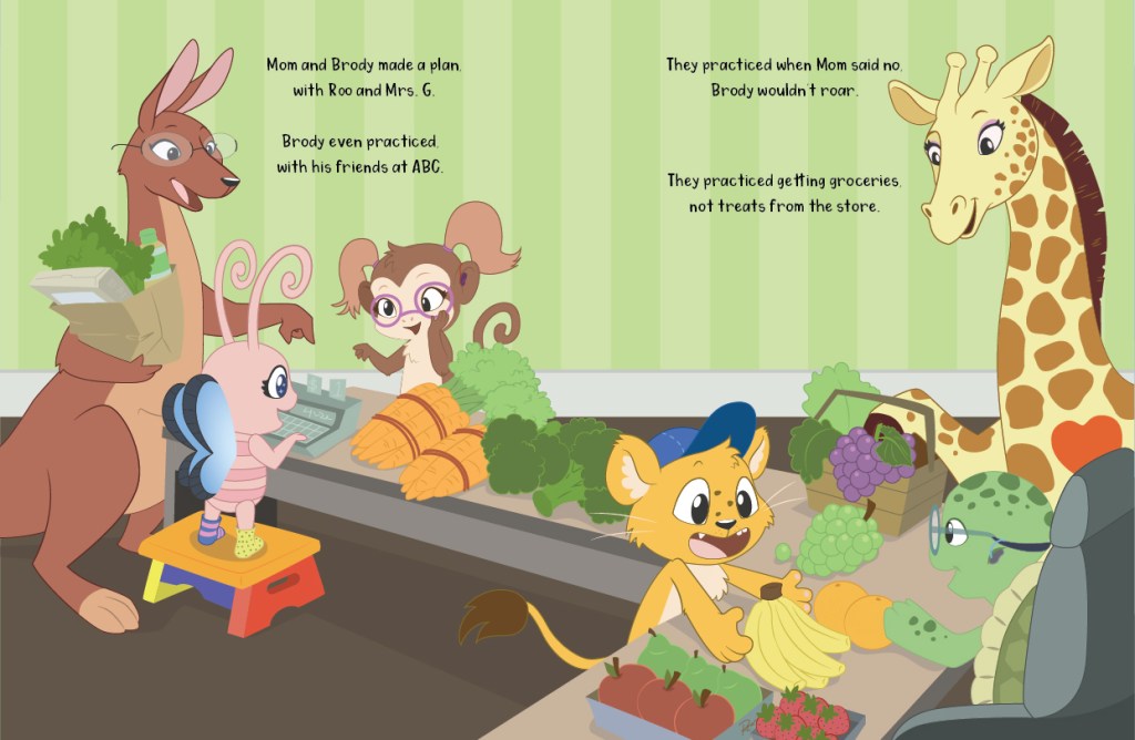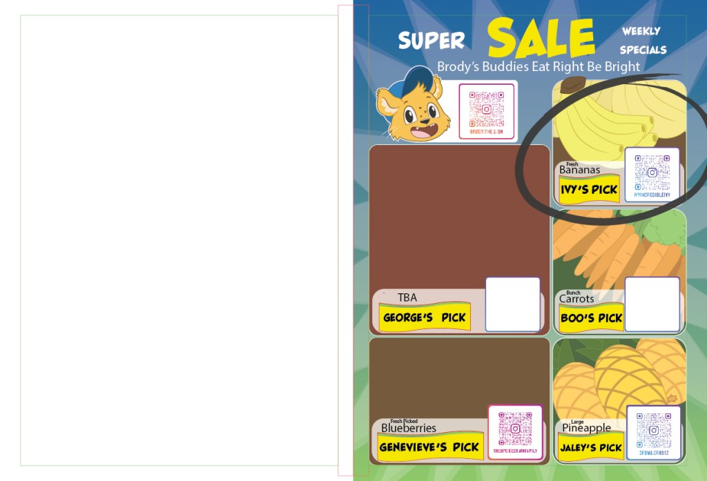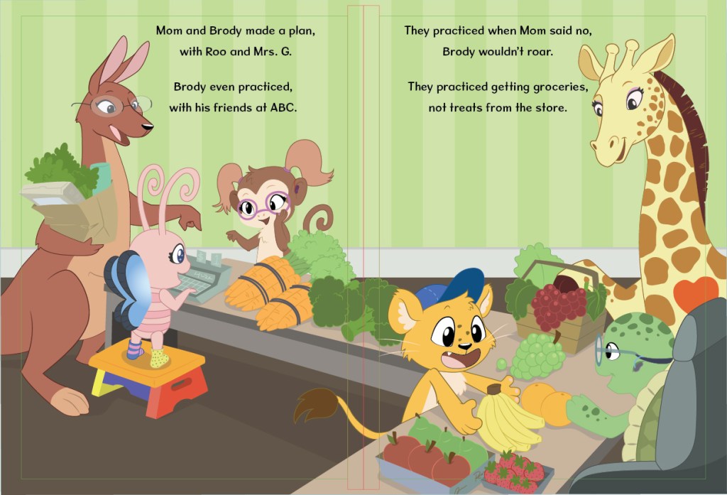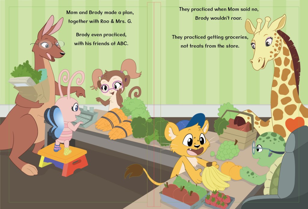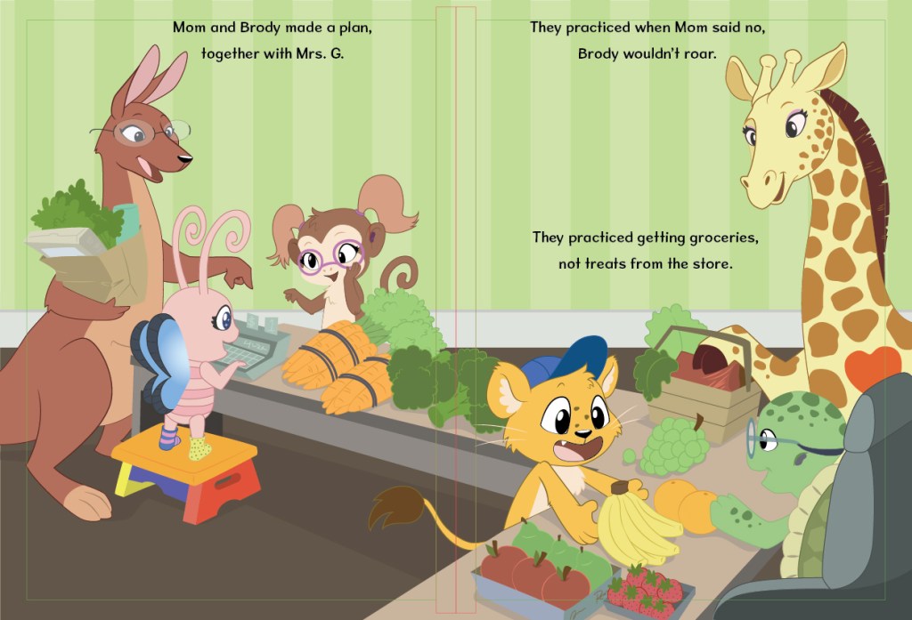 Updated pages based on notes from last meeting. The page numbers in green represent good/approved. I’ve made some minor position changes to text placement, changed to font ‘Sweater School’ and other fonts for the title. Worked out some of the backgrounds a bit further spacing them out as well as the grocery store pages.