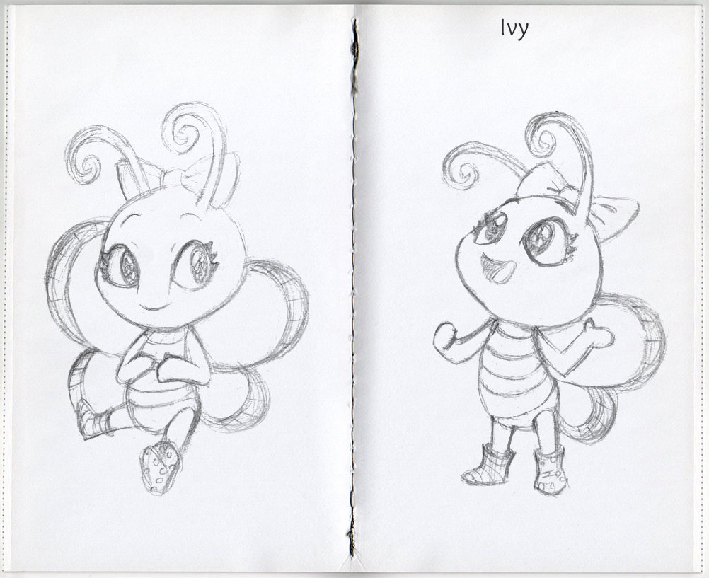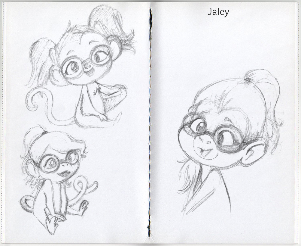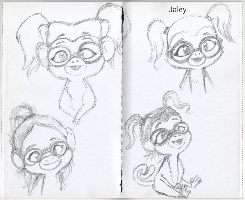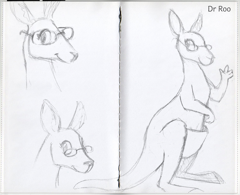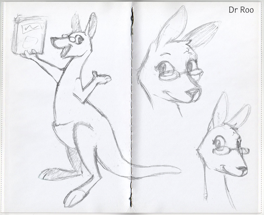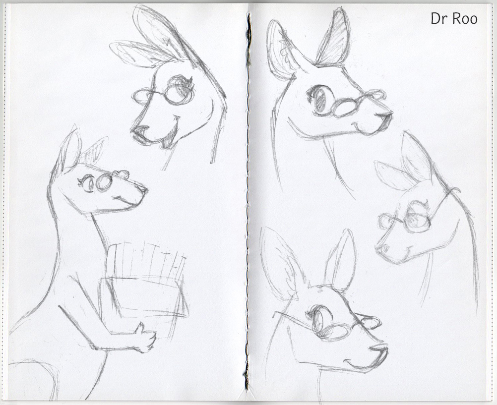 Character concept sketches for Dr Roo, Jaley, Genevieve, George and Ivy.