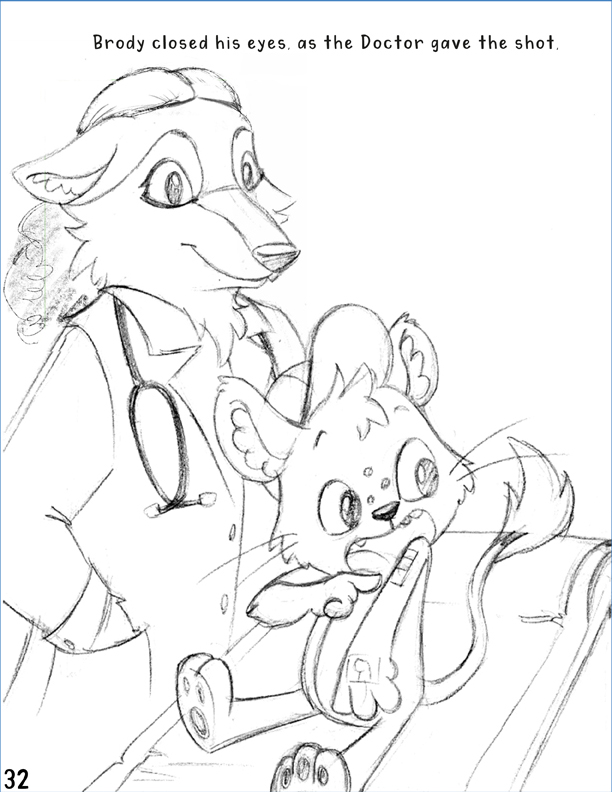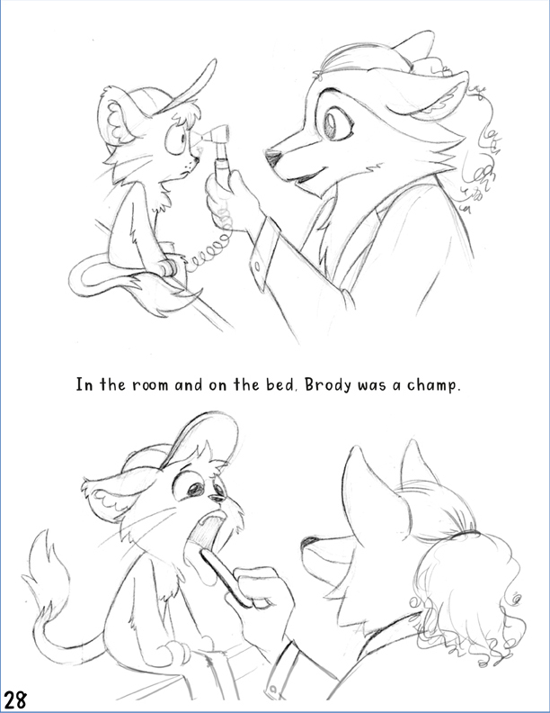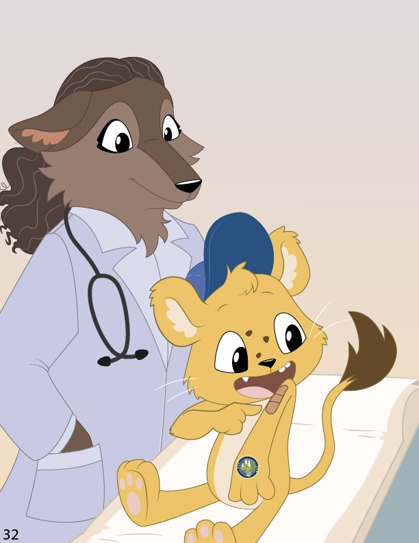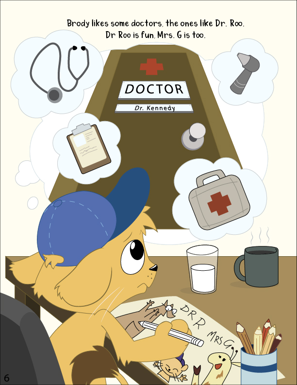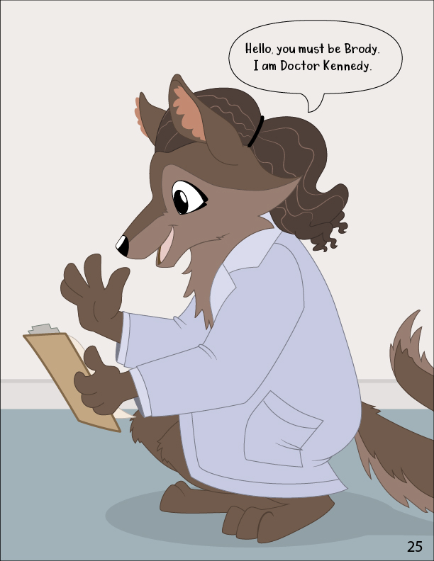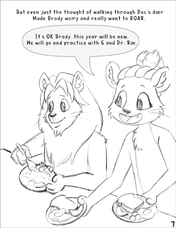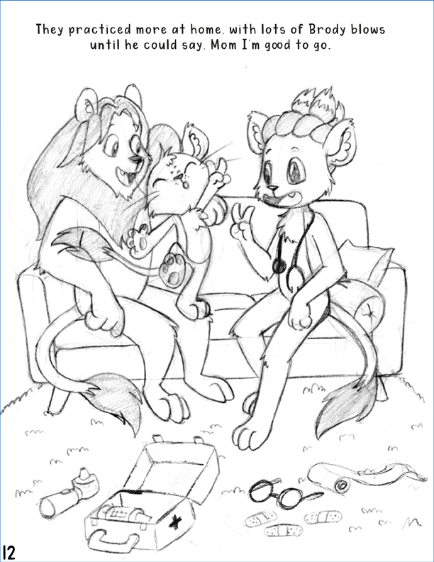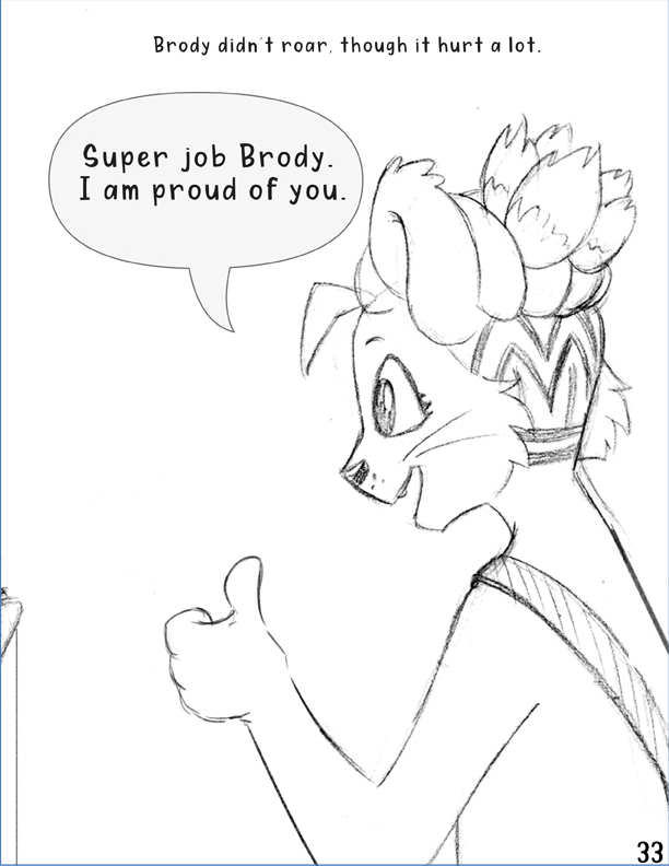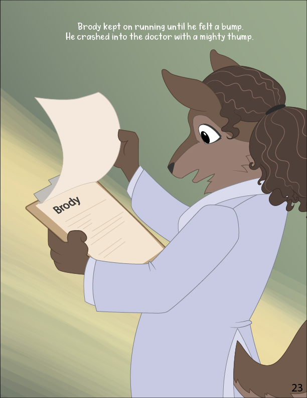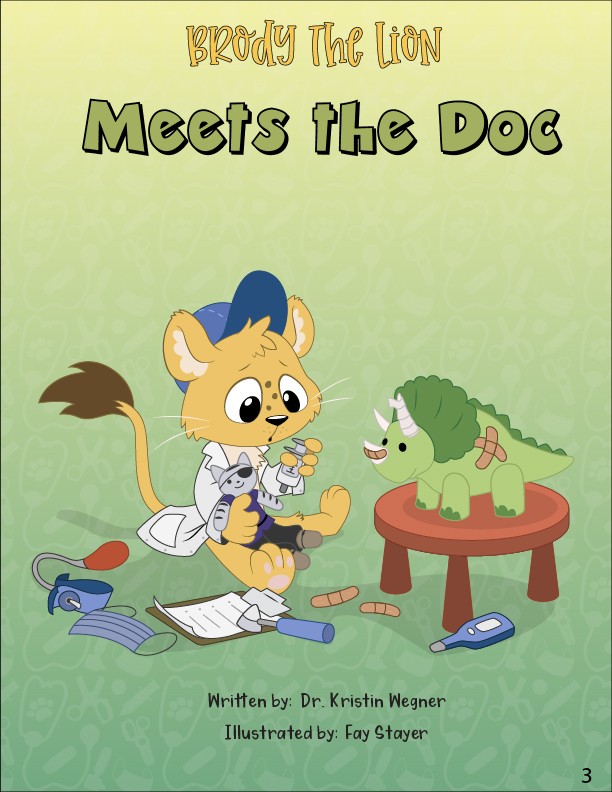 Brody the Lion Meets the Doc March 9 2022 All pages colored. This will be the last page. Page 38 The above is placeholder text for dedication from the previous book. Going to try a white font color. Dr Kennedy’s neck has been lengthened a bit in the close up of her. BLT – page text updates.