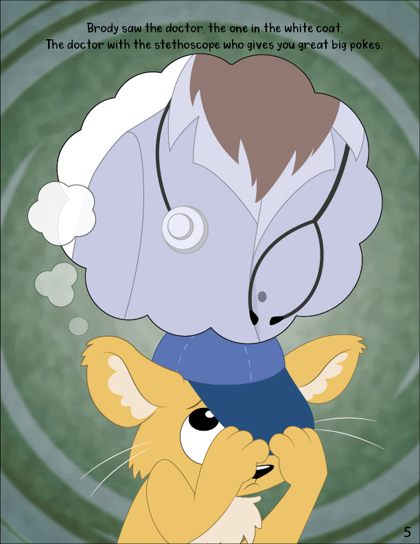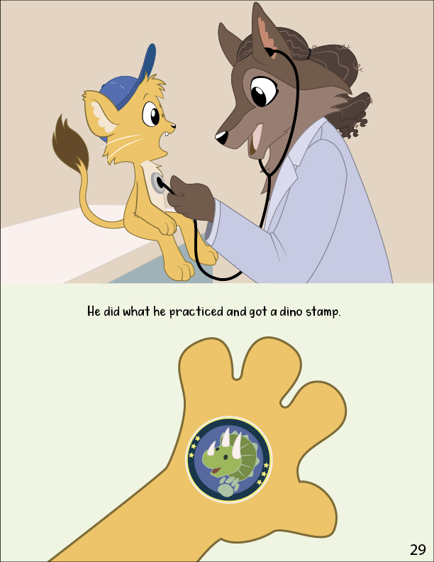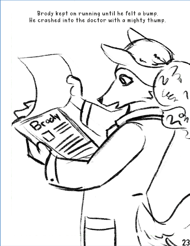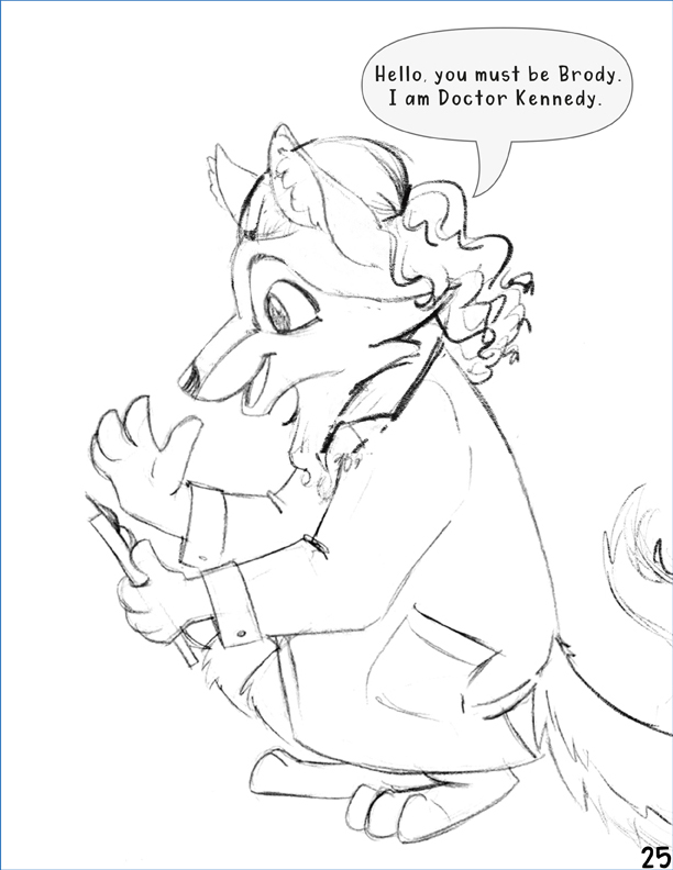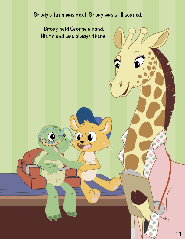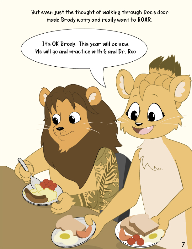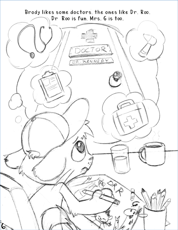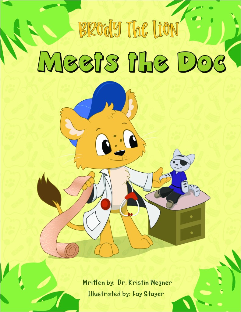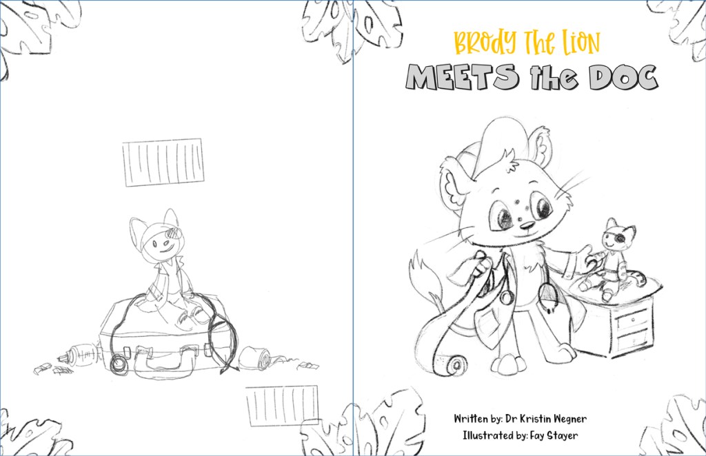 Brody the Lion Meets the Doc March 9 2022 All pages colored. This will be the last page. Page 38 The above is placeholder text for dedication from the previous book. Going to try a white font color. Dr Kennedy’s neck has been lengthened a bit in the close up of her. BLT – page text updates.