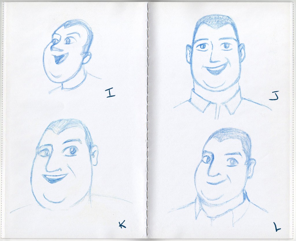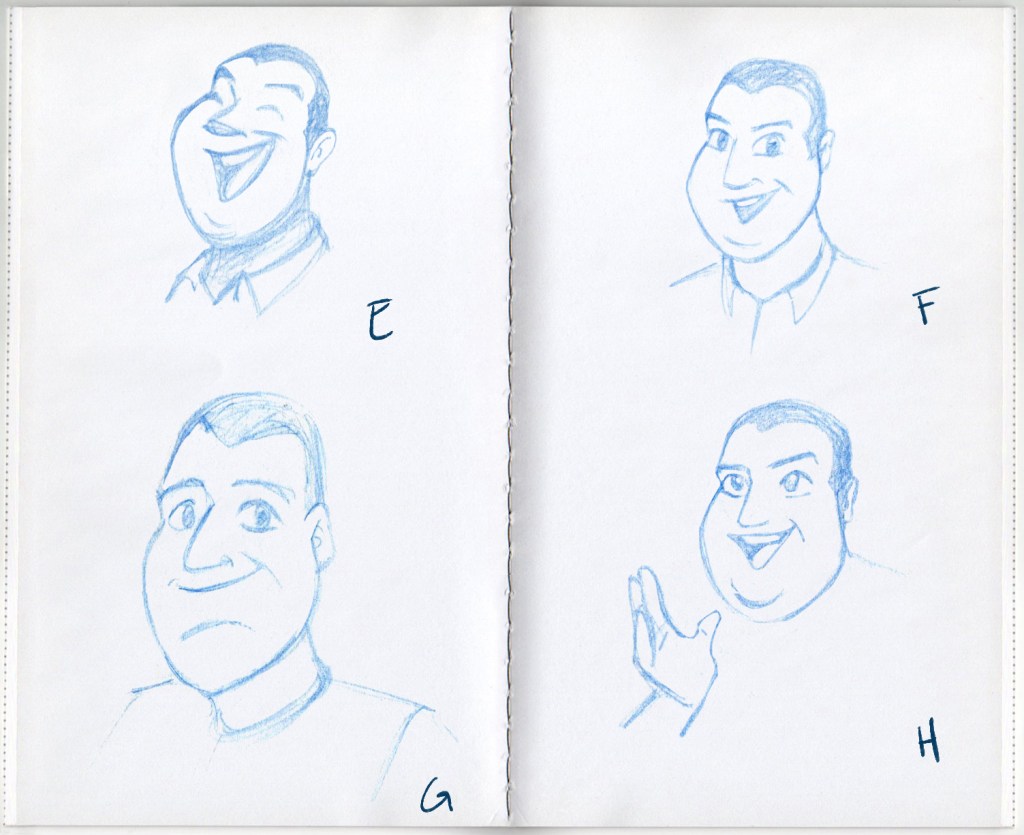 Various sketches for Jeffrey’s character, a few of Jonathan and some various body proportions from tall to short.