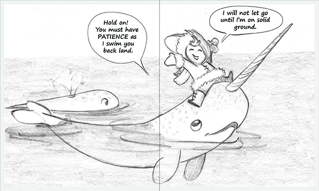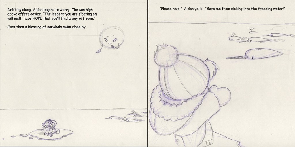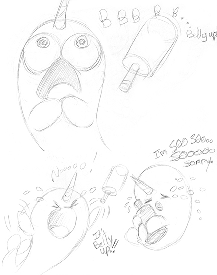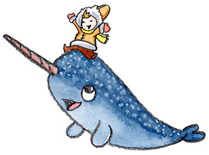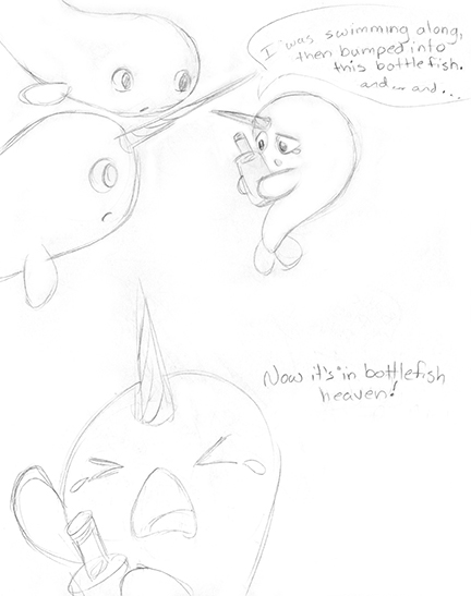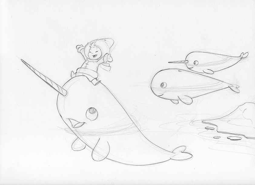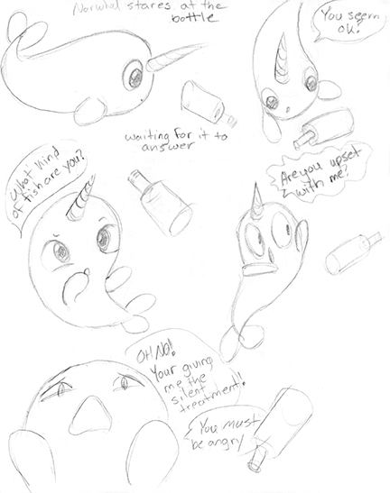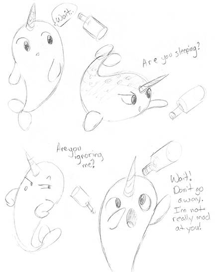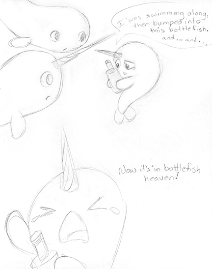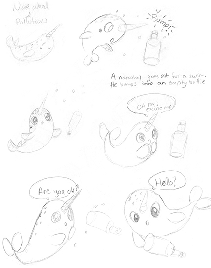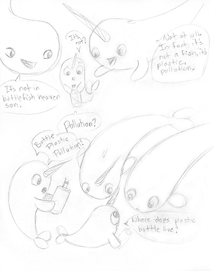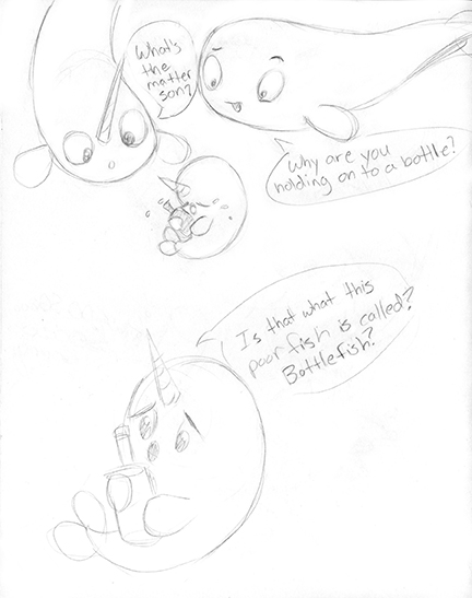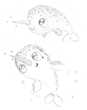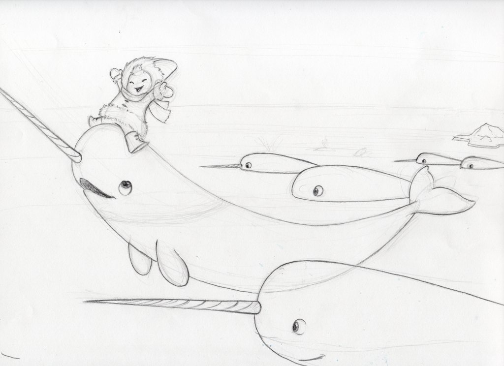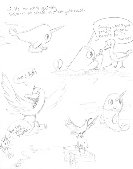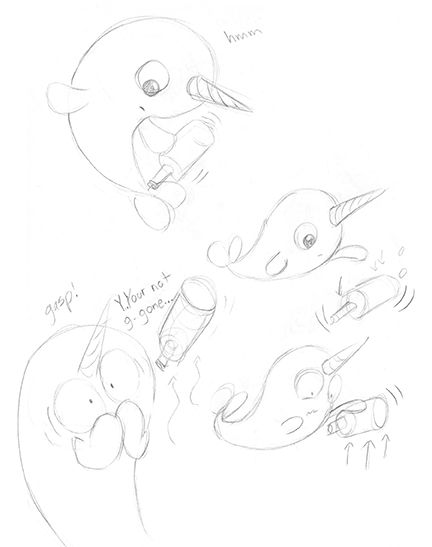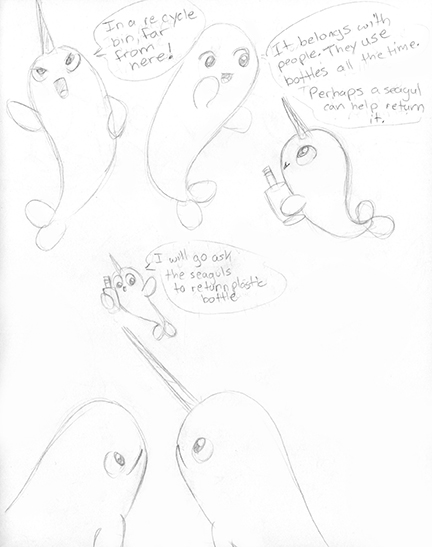 A quick sketched idea about a baby narwhal bumping into a bottle and how he may interact, communicate or react to this unknown object…or fish?
