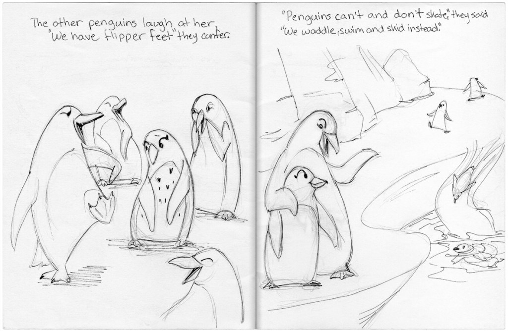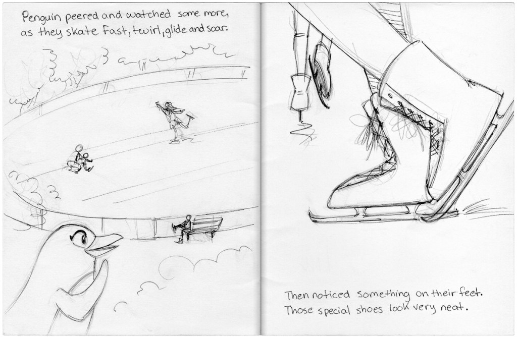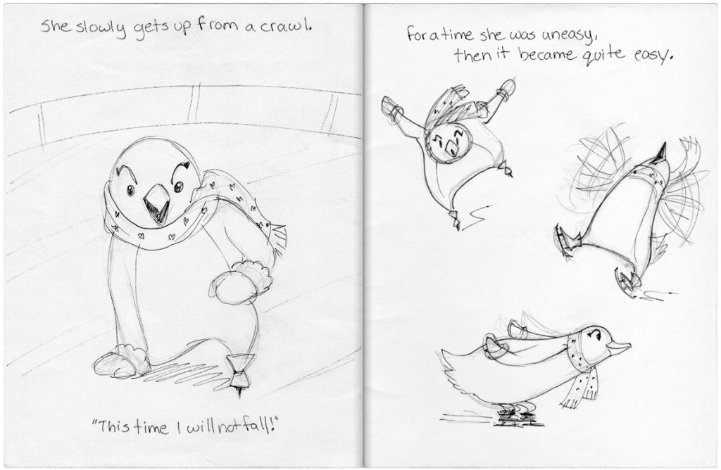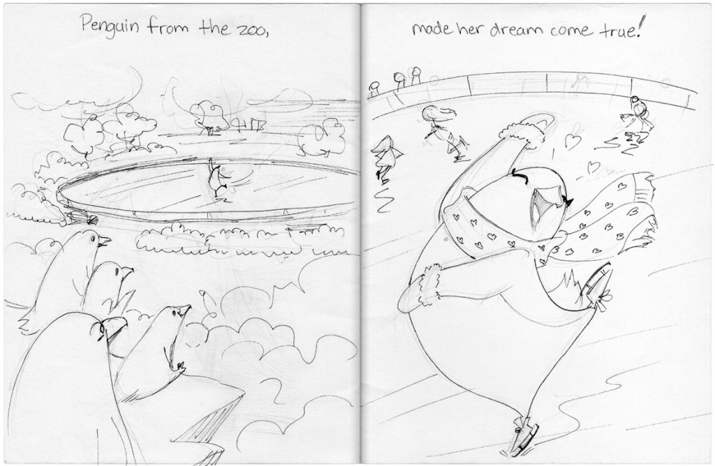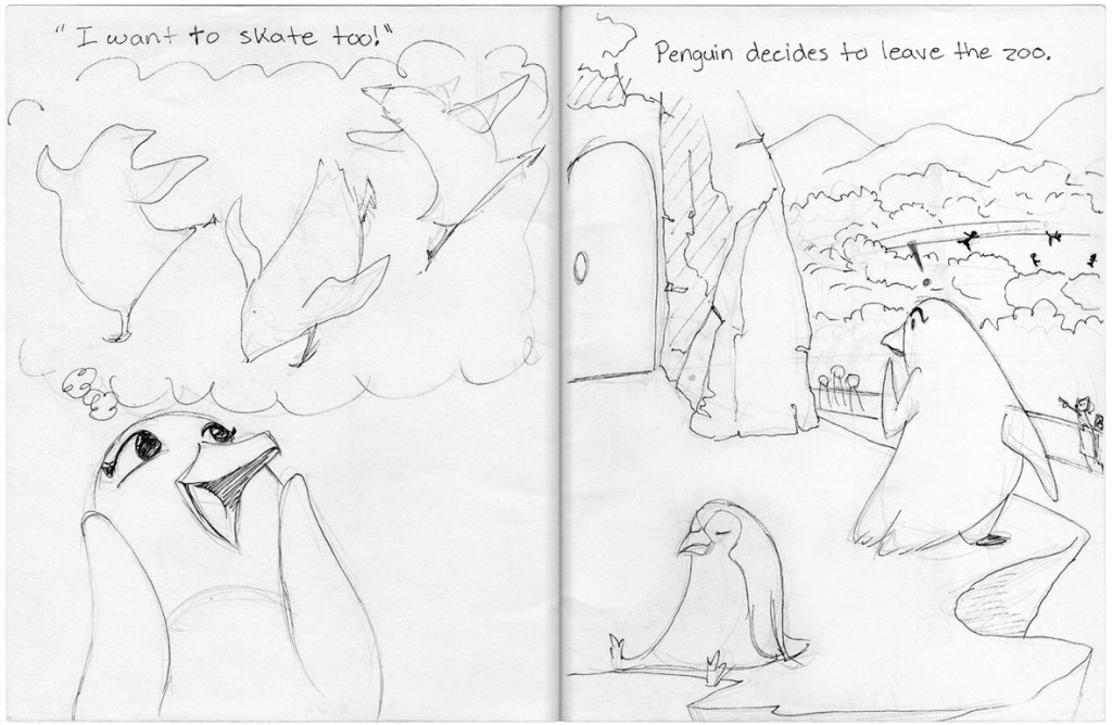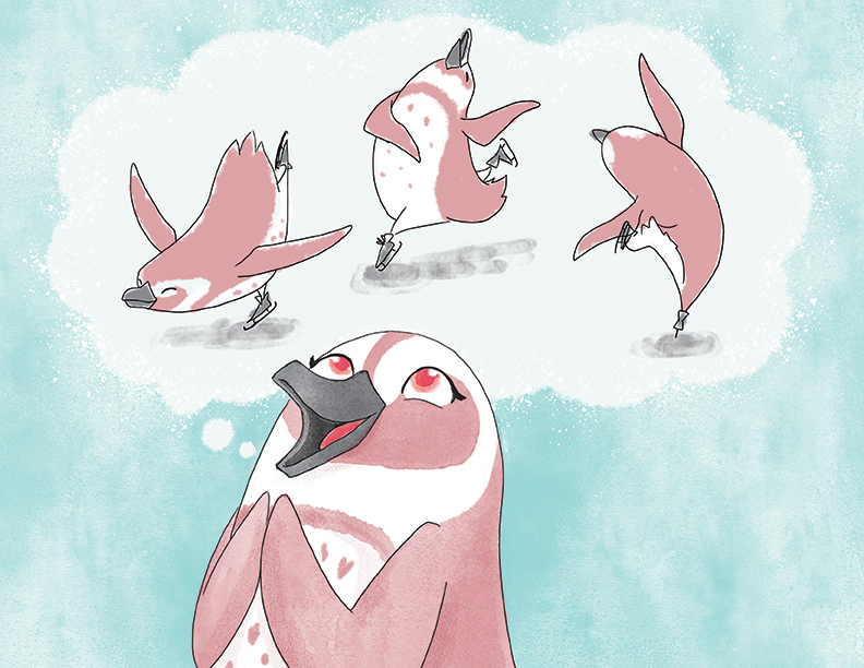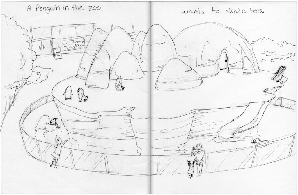A story project about a penguin that dreams of skating but can only watch from afar up top her rocky cliff in the zoo.