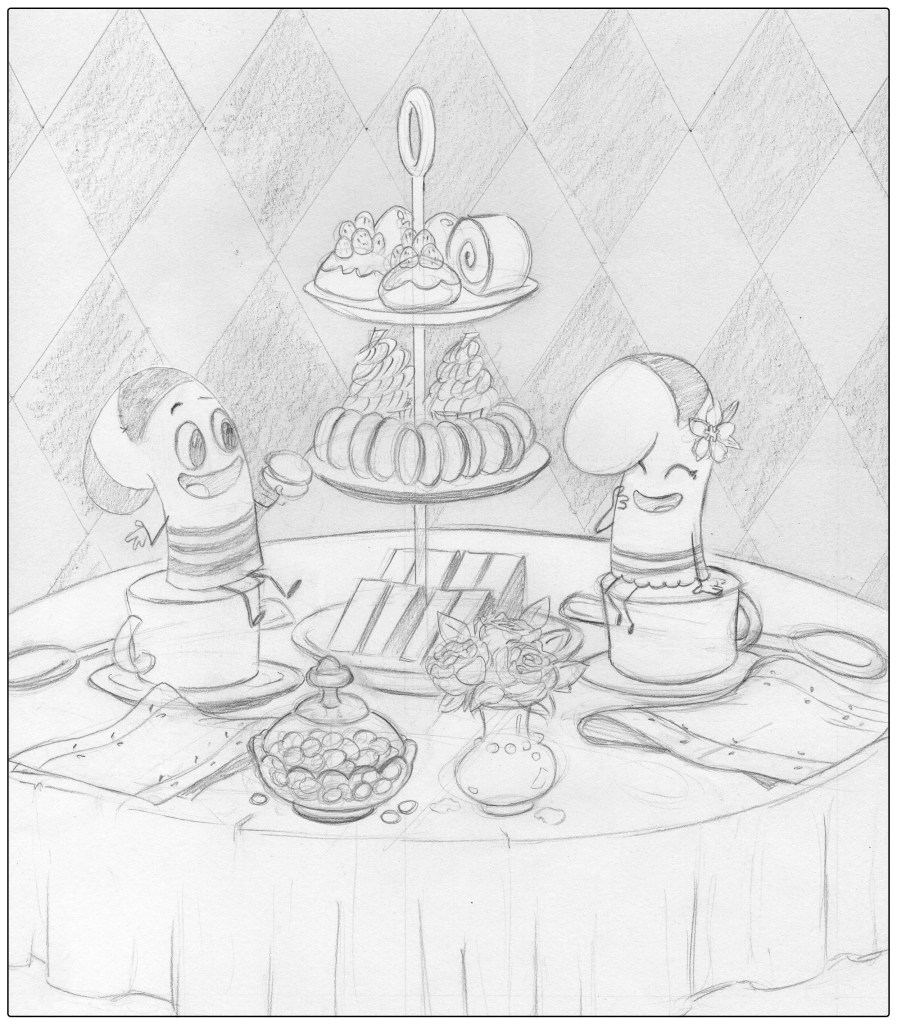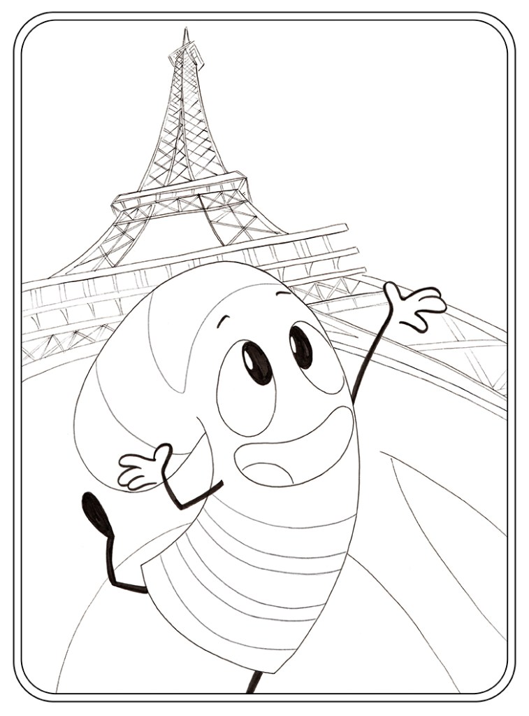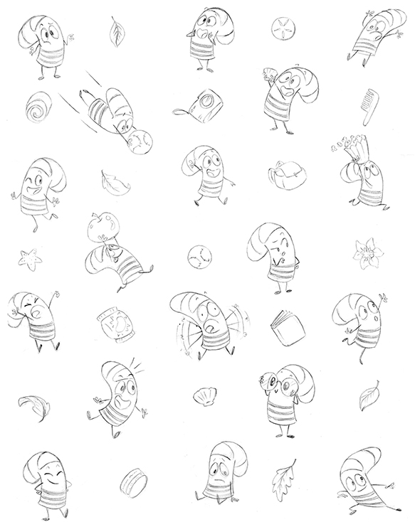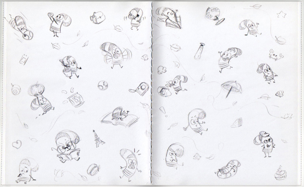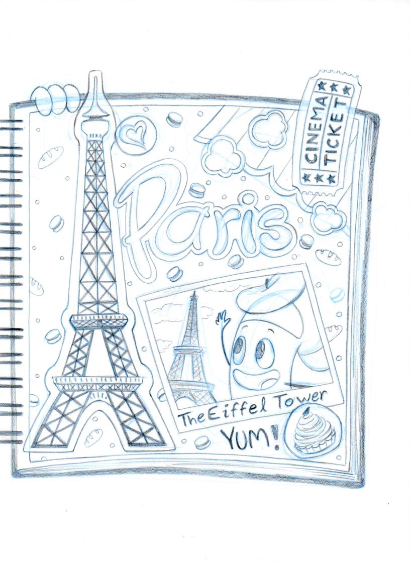 For these sketches I really got into them right away and I’m also trying to work out a good angle for Sammy picking out books at the library. The images for Paris I have Sammy taking a selfie with the Eiffel tower which I’m still working out a good angle for. The last one is him skipping happily by some bakeries and cafe down the street and feel this one hit the mark.