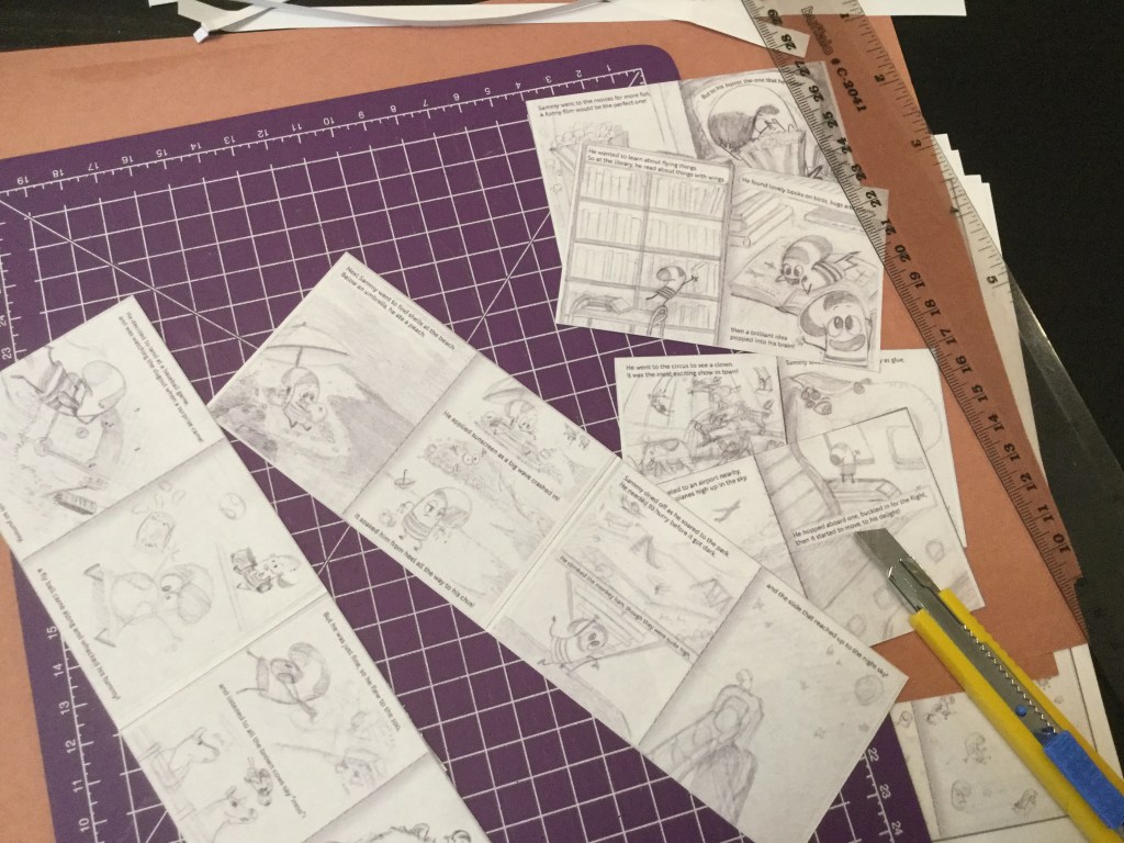 Below are printed images of the thumbnail sketches of the book before the above changes happened which I cut together and bound them in to a mini book to help check the flow while physically flipping through. I’m preparing files for you to print at home to create a mini book to flip through as well.