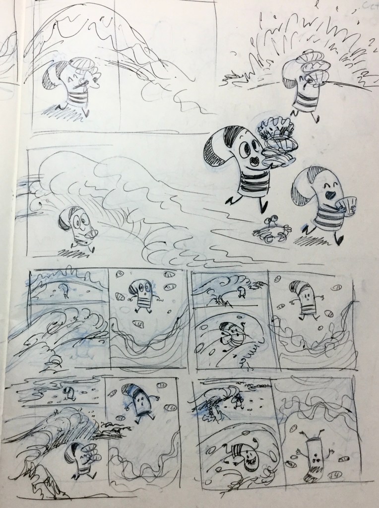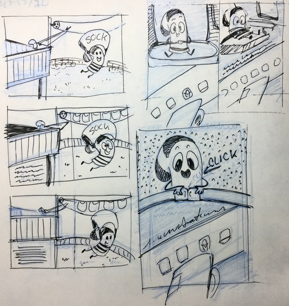 Below are rough storyboard sketches for Sammy so far. I’ve used some of the words with the images to help figure out placement.