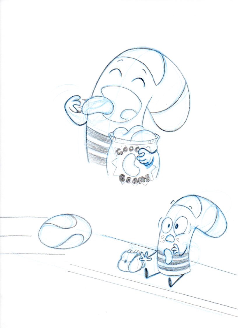 Some sketches of Sammy with different expressions and design ideas for his characteristics. I have notes layed out to help decide how Sammy will look and different features he will have as he gets closer to his final. Some features I’m considering and questions about him:
