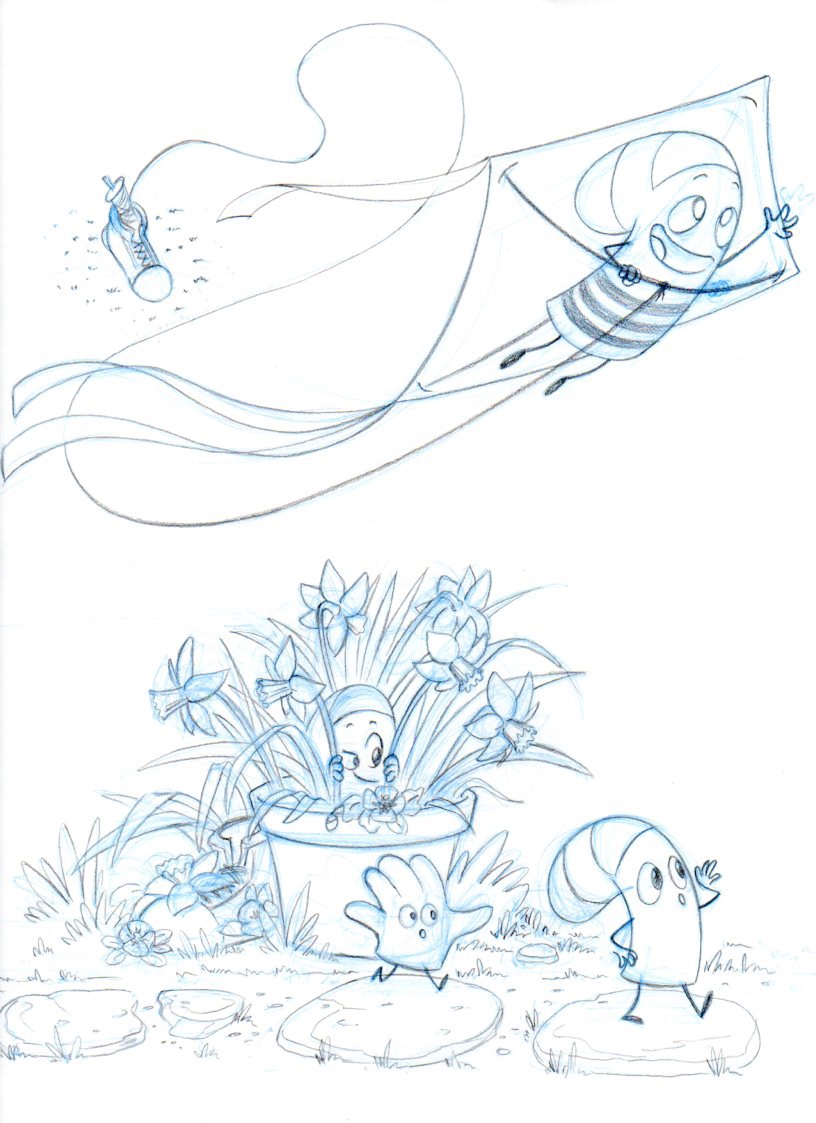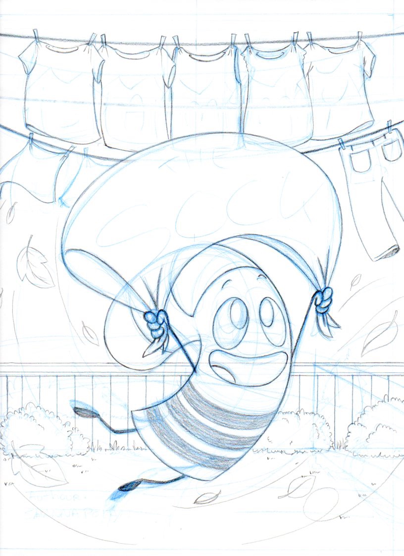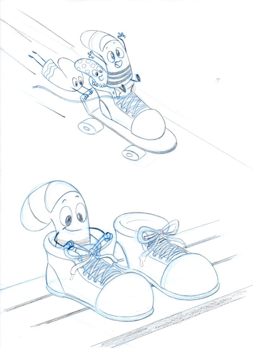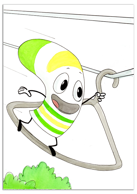 Colored pieces for pages where Sammy rides the laundry line and ready to take off with the wind to his first destination. I ended up switching his heel color(yellow) with his toe color(green) so green doesn’t interrupt his eye brows since green is a darker and the eye brows may not be as apparent. Let me know what you think and if you prefer the heel green I can change it.