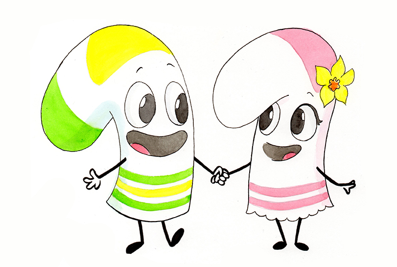 The first sock is done in watercolor, pen with pencil shading. The second sock is pen and water color. The third is digitally colored.