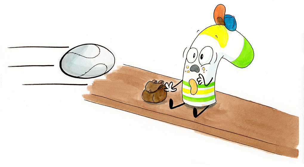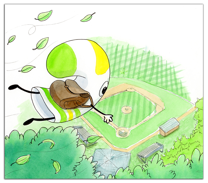 Here is a sketch of Sammy with your Dad enjoying the baseball game. I also worked out more of the beach scene and sketched out Sammy trying to pull down a peach from a branch.