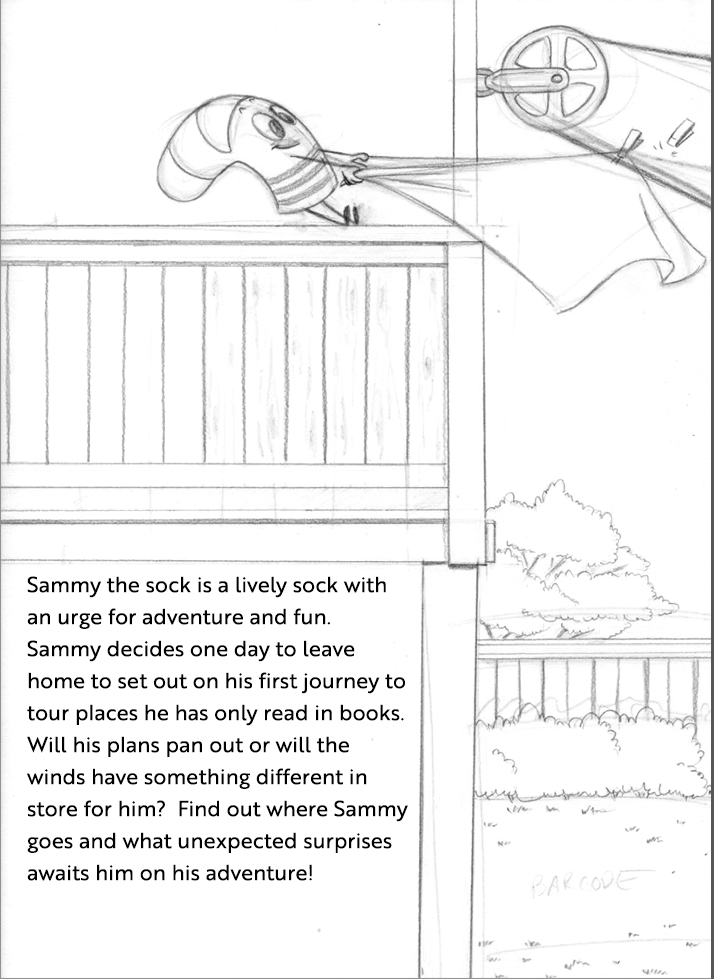 Here are a variety sketches that have been added to the story. The first image has some sketches of our sock characters and Sammy with your father…although I don’t know what your father looks like so I just drew the posing of them together. I used the image of them in the second picture with thumbs up in Sammy’s scrapbook.