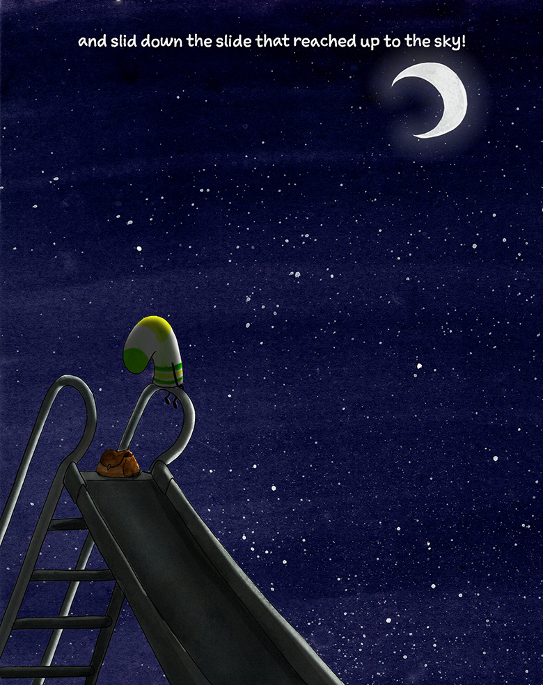 Below are two images of the park scene back to back. The only suggested change is the word placement for this particular sentence in the story. I’m suggesting the change based on a previous email mentioning how Sammy sitting atop a slide will make a great image and I agreed. Both work well although I do feel version 2 works a bit more. This is merely a suggested idea to swap ‘monkey bars’ with ‘slide’ and it doesn’t need to be the words I’ve typed here but tried to keep it close to what you have.
