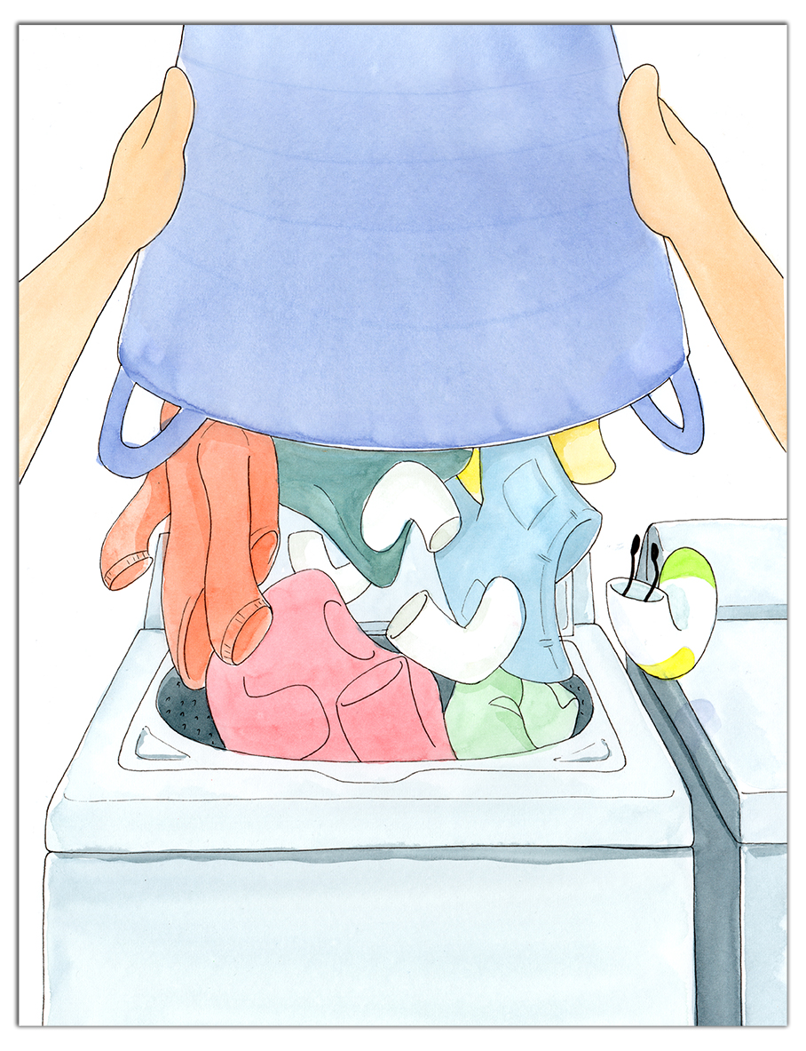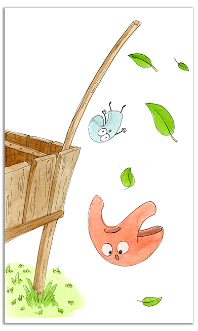 Theses are some new sketches that I have been working on toward the manuscript changes. I also drew up Sammy heading into the laundry room in a laundry basket on the way to the wash. He falls off to the side as the laundry basket full of clothes is emptied into the machine. This will further strengthen and help set it up for the beginning of the story when he is in the laundry room. This will be a part of the credits/publishing info pages instead of the peach picking and other sketch that’s currently being used.